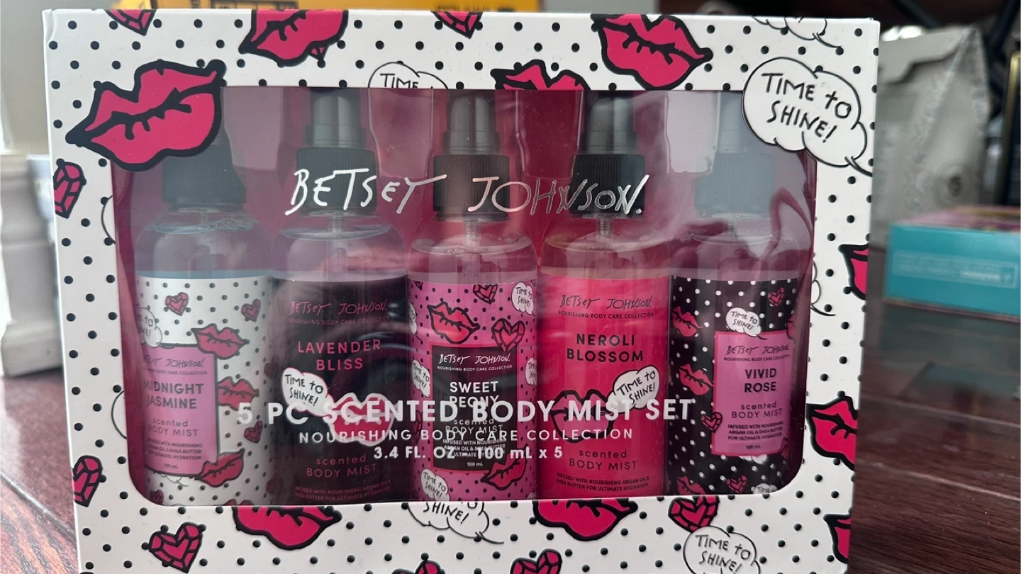 This Betsey Johnson 5-piece scented body mist set includes Midnight Jasmine, Lavender Bliss, Sweet Peony, Neroli Blossom, and Vivid Rose. Each mist is 100 mL and infused with nourishing Argan Oil & Shea Butter for ultimate hydration. It's a delightful collection for everyday freshness!