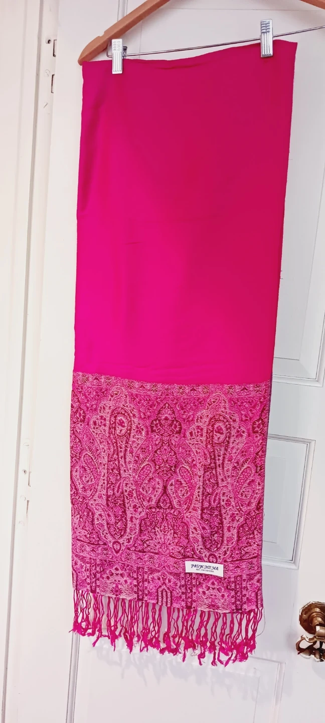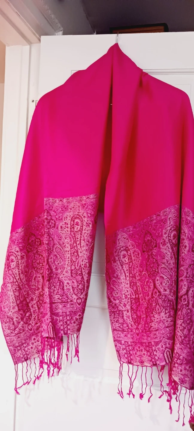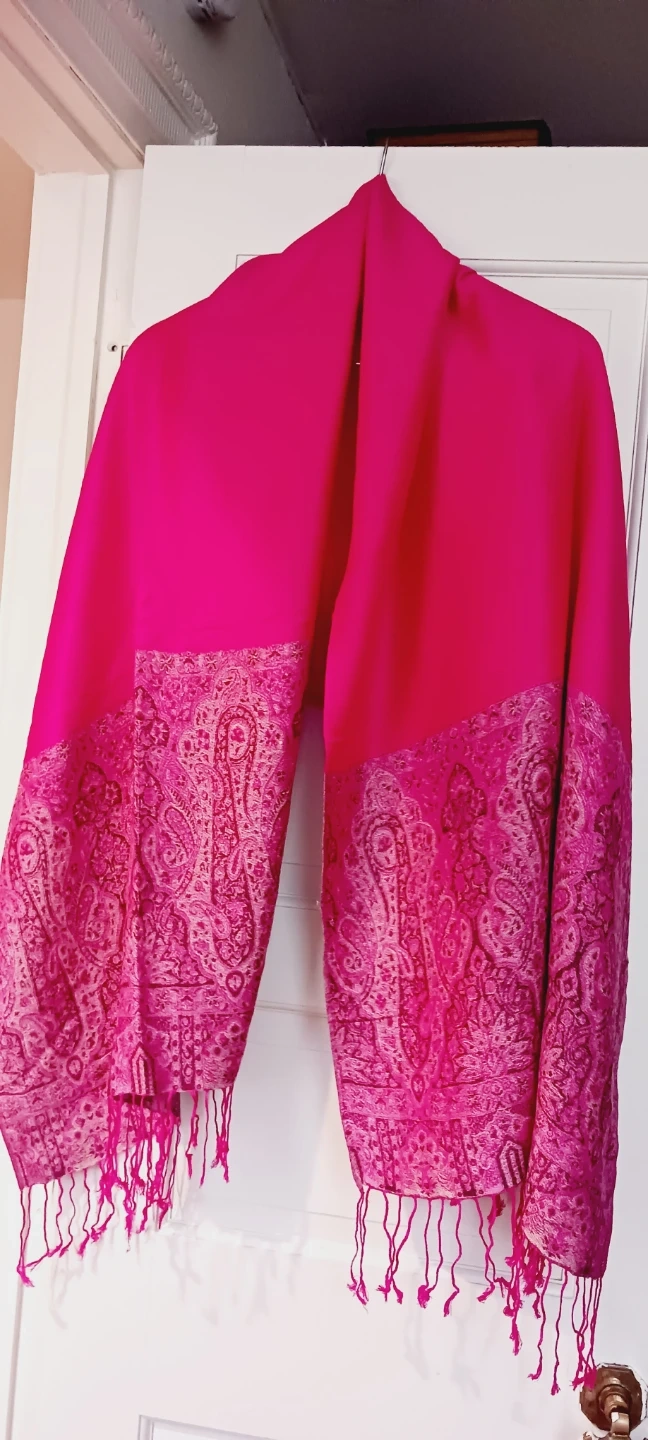 Elegant Comfortable Hot Pink Pashmina Scarf. It has a lovely paisley pattern on the bottom half and fringe along the edge. It's a perfect accessory to add a pop of color to any outfit !! 75"×25". ALL MY PRICES ARE NEGOTIABLE !!