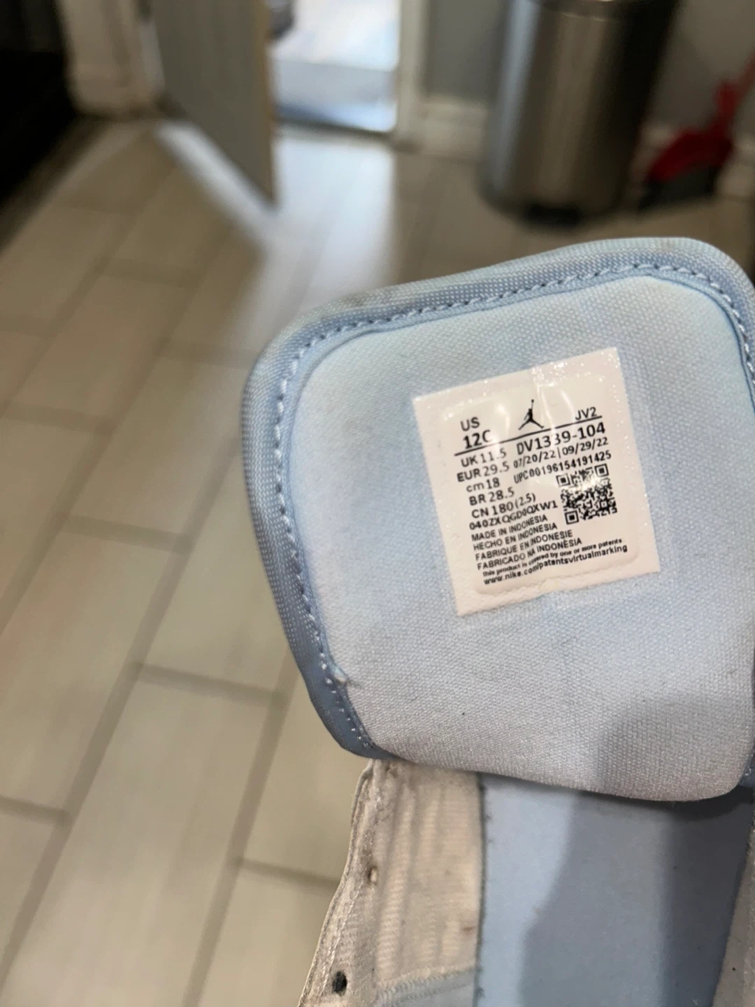 Jordan 1 Mid SE toddler shoes in size 12c. These feature a white, black, and light blue colorway. They're made with synthetic leather and rubber.