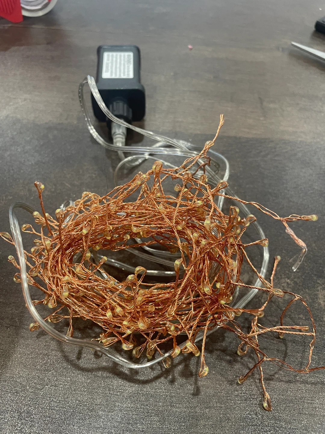 Copper wire string lights with a clear cord. These lights have a warm white glow and come with a power adapter. They're great for decorating.