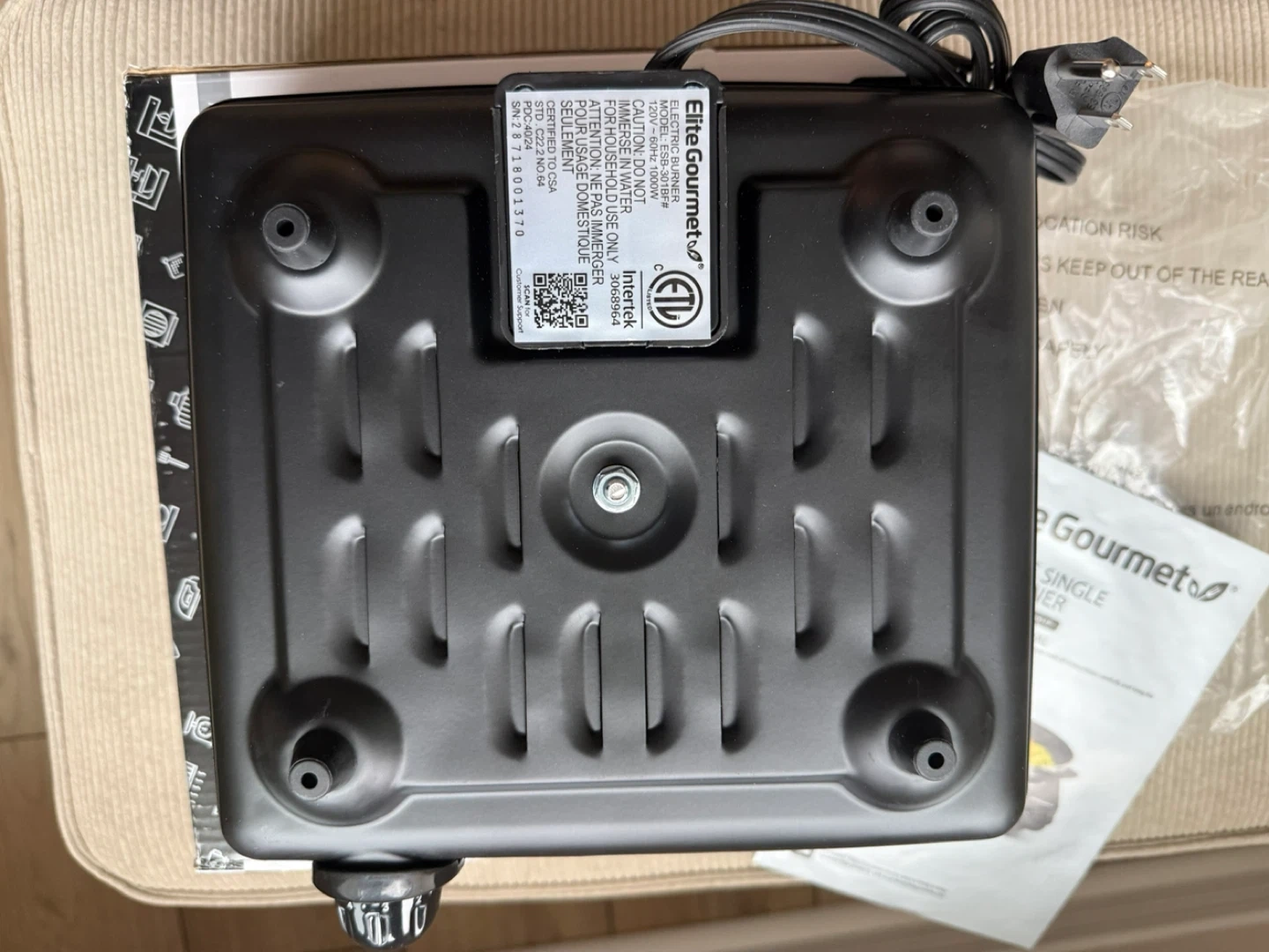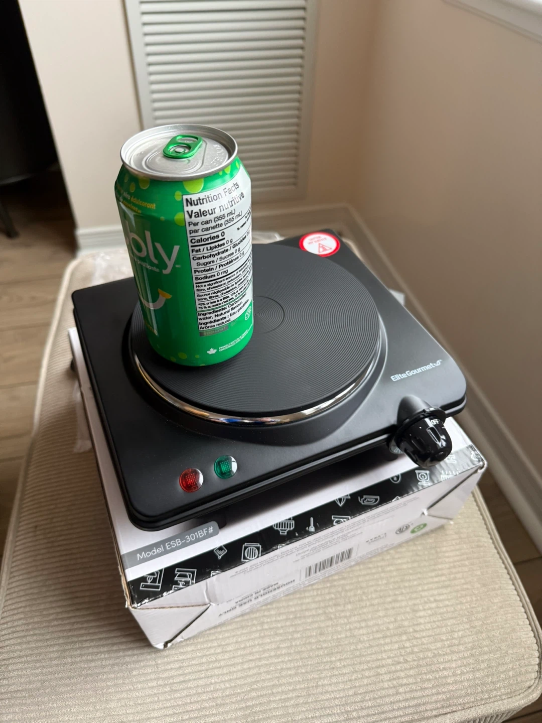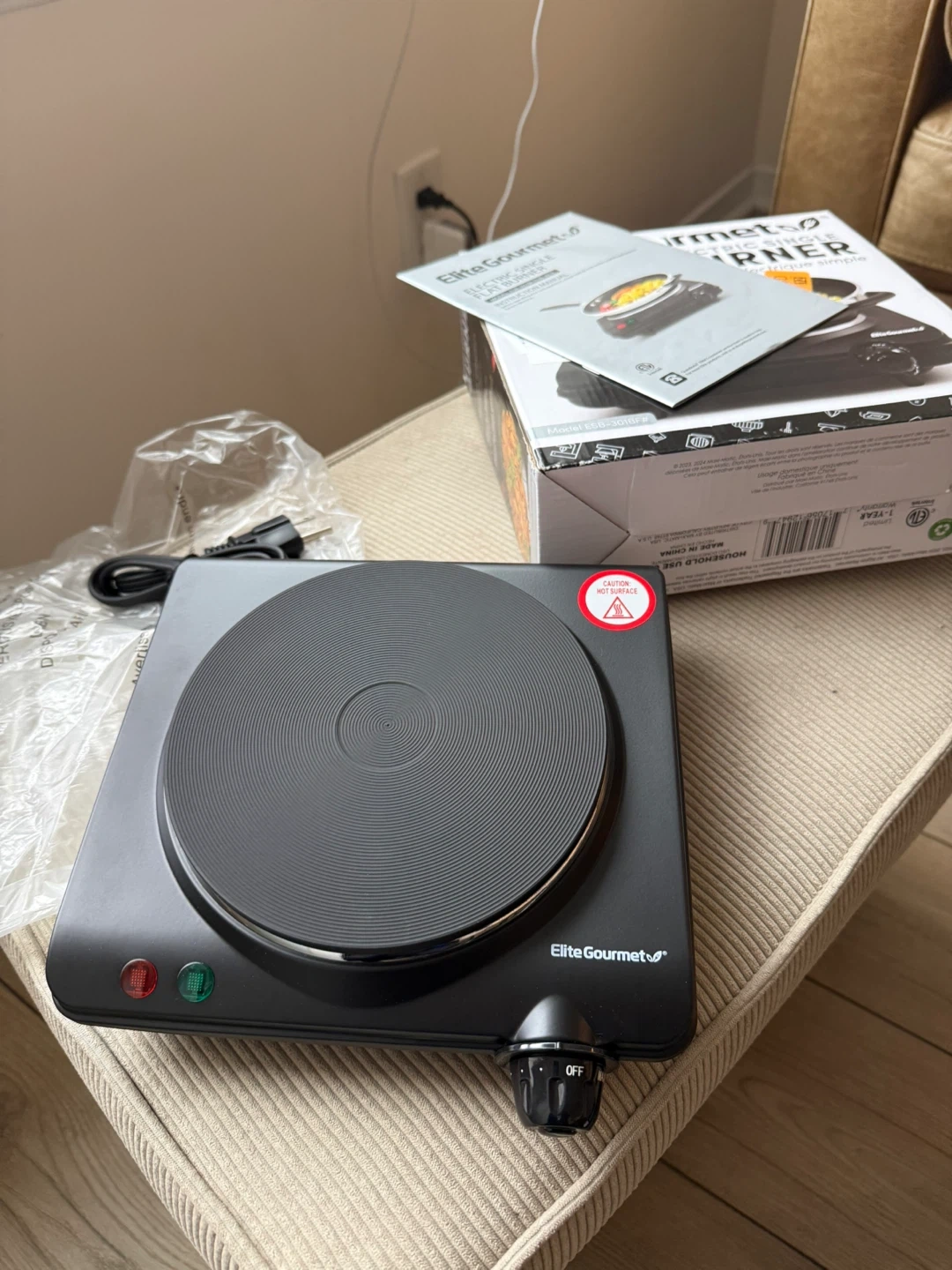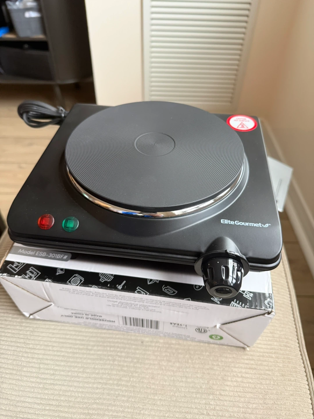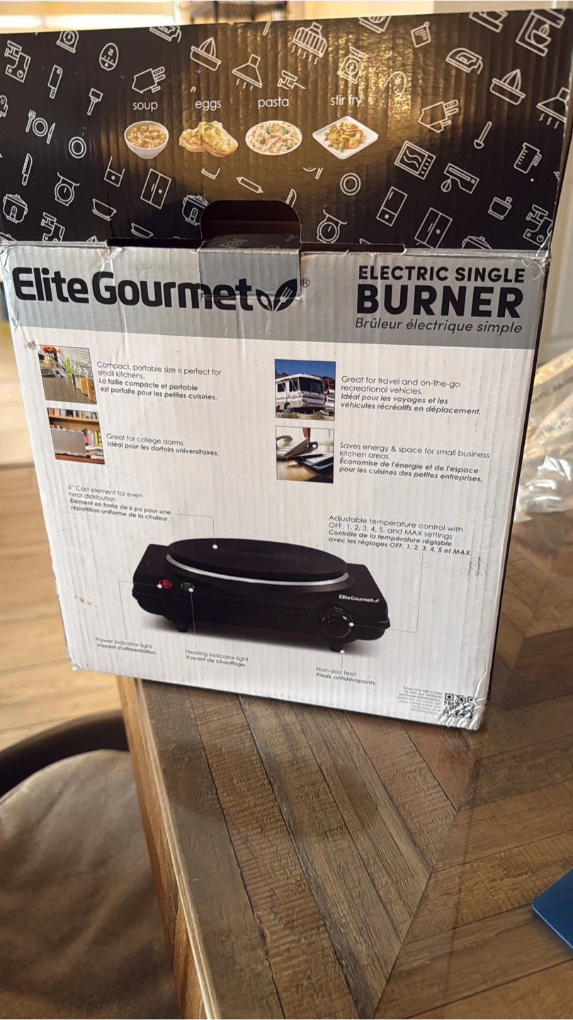This is an Elite Gourmet electric single burner. It comes with an adjustable temperature control. The burner is compact and portable, great for RVs, dorm rooms, or small kitchens.