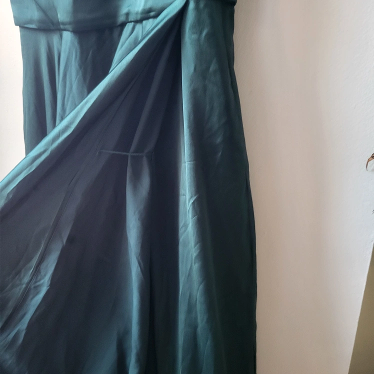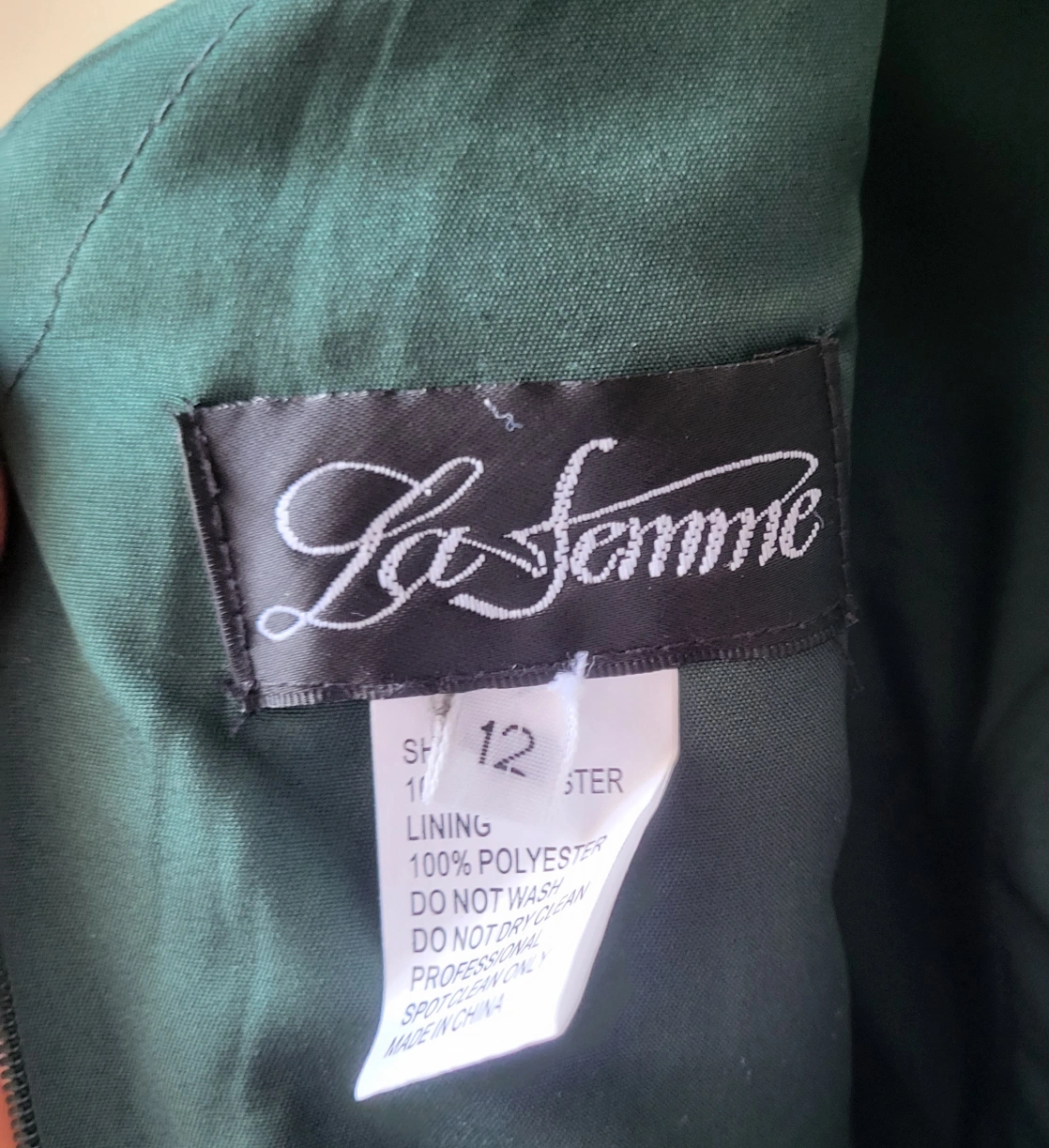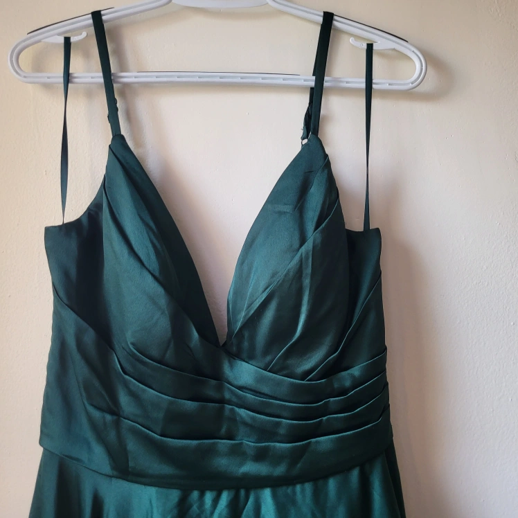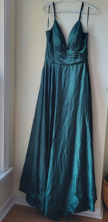 Be the belle of the ball in this stunning La Femme maxi ball gown dress. The dress features a flattering A-line silhouette with a silky satin fabric in a beautiful emerald green color. The dress is new without tags and is perfect for any formal occasion, including weddings, parties, and cocktail events.