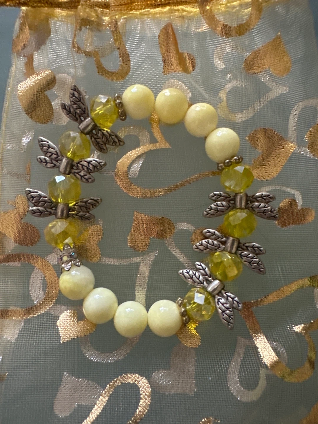 This bracelet features smooth yellow beads interspersed with faceted clear beads and silver-tone dragonfly charms. It's stretchy and comfortable to wear. The dragonfly charms add a delicate, whimsical touch!
