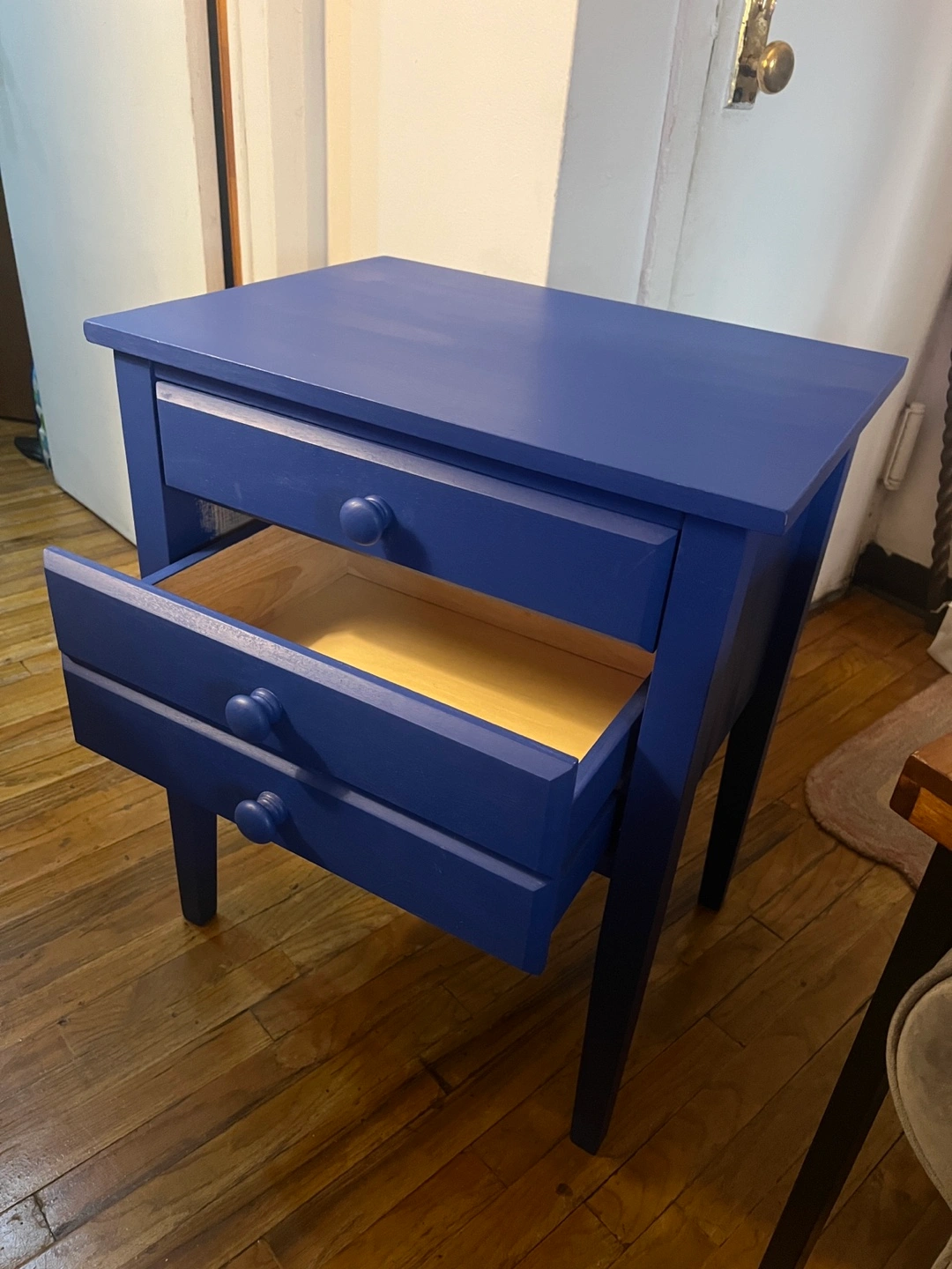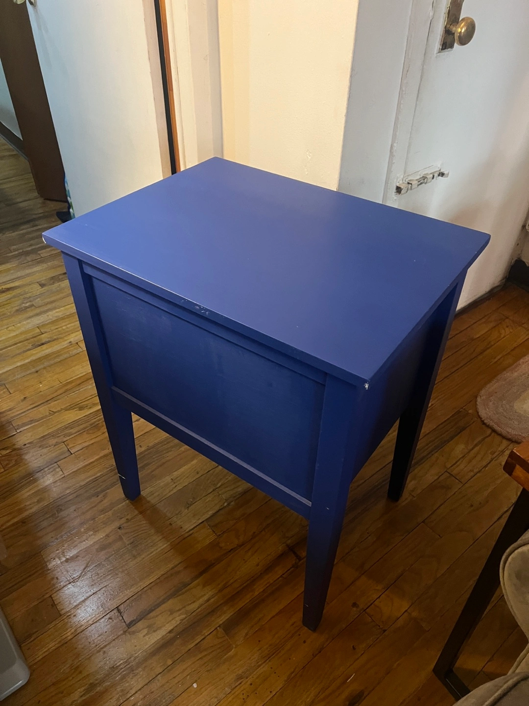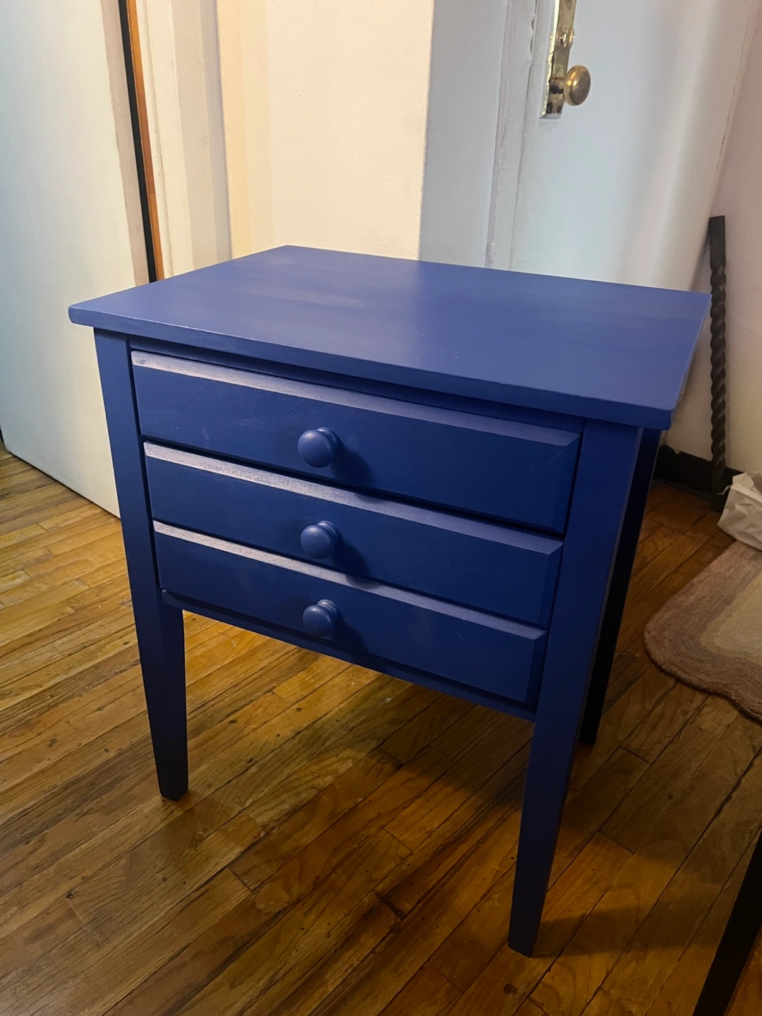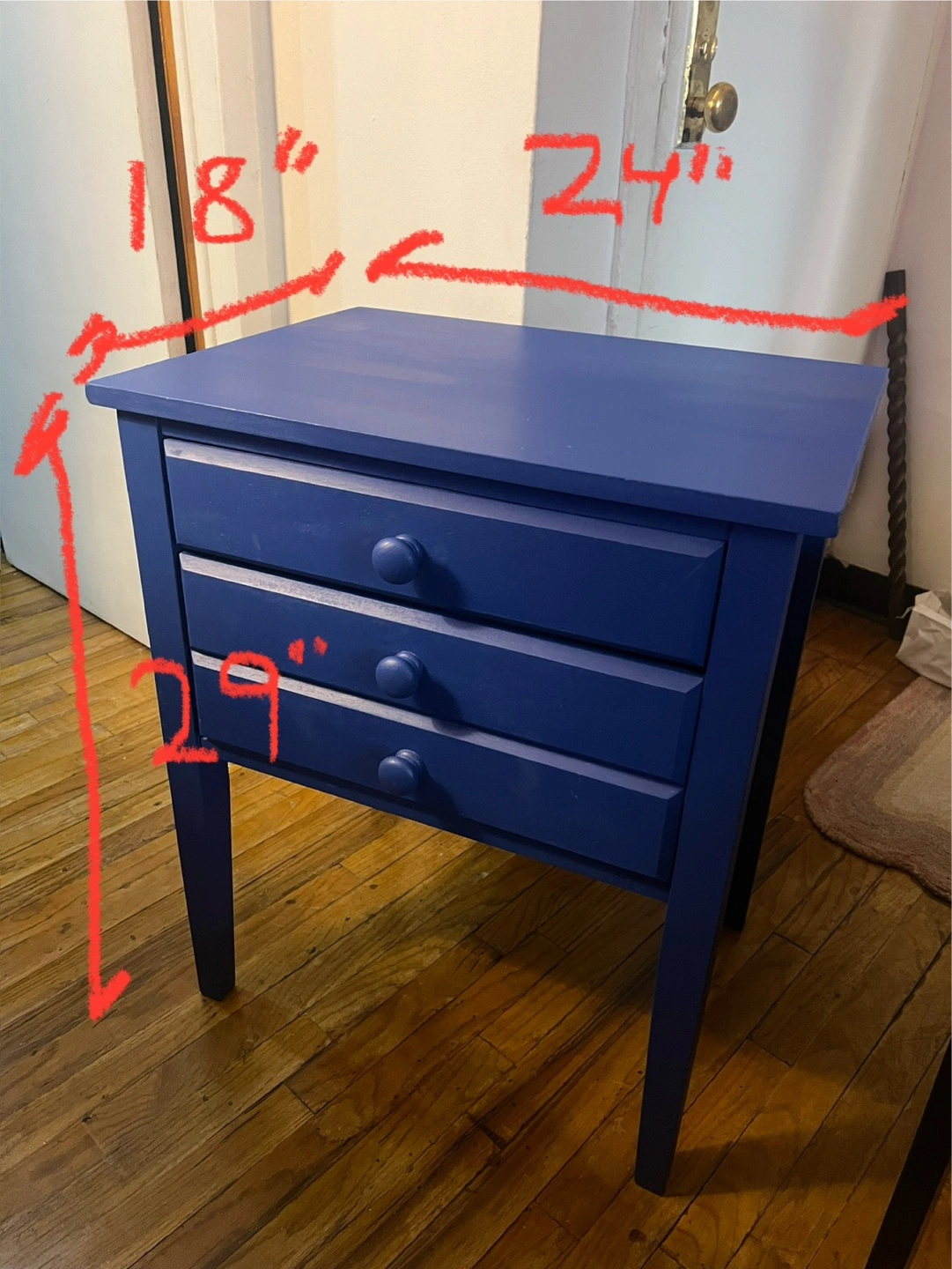 This small wooden dresser is painted a beautiful blue, and makes a perfect accent piece! There are extremely minor imperfections in the paint, mostly on the back where it has been up against the wall. It can be carried by one person. Approximately 18"D x 24"W x 29"H.