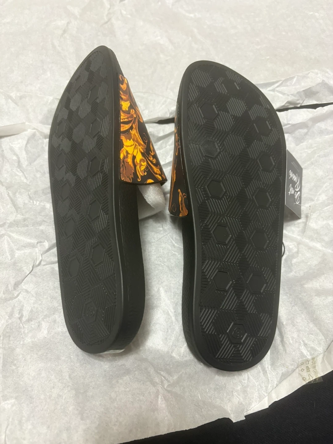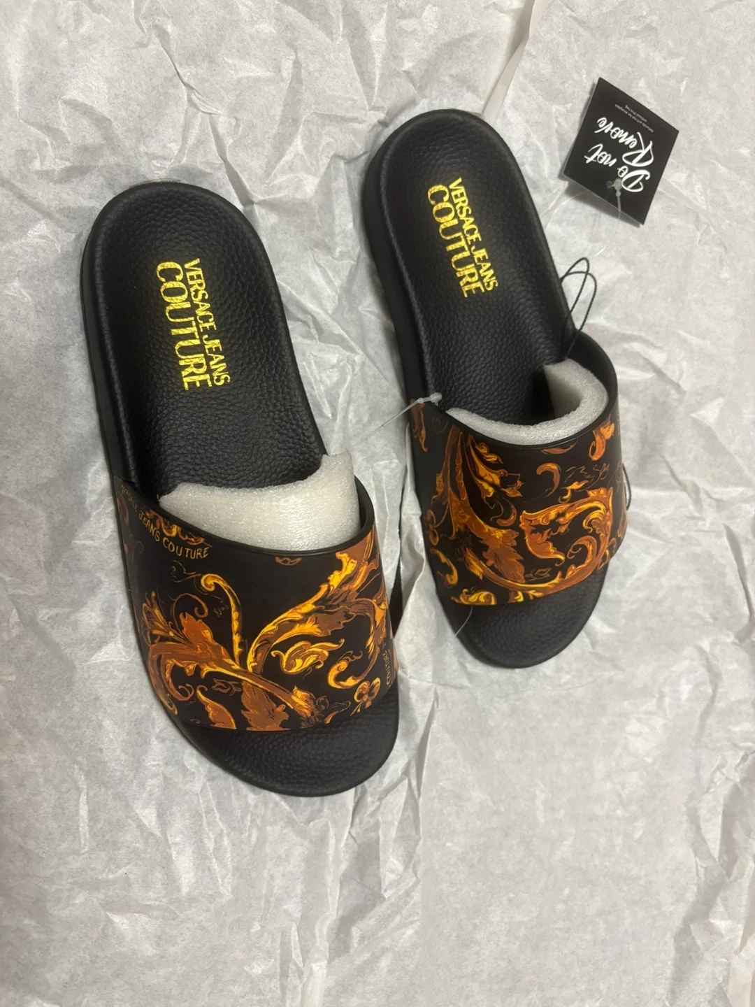 These Versace Jeans Couture slides feature a bold black and gold baroque print. They're designed for comfort and style. Perfect for casual wear!
