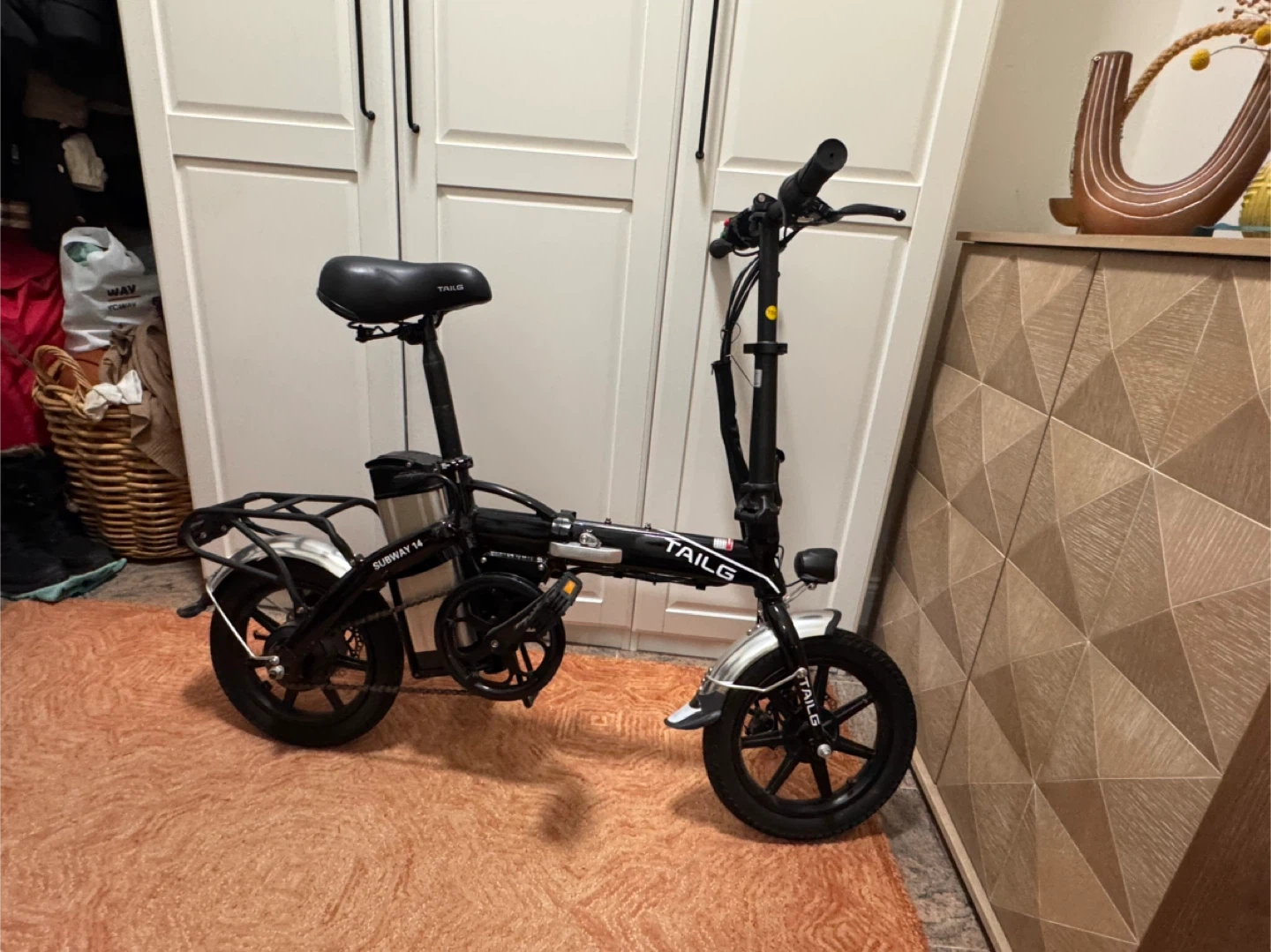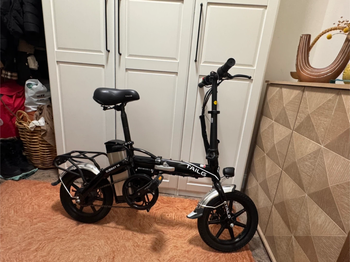 TAILG Subway 14 folding electric bike. Black color. Features a rear rack and fenders. This bike is designed for convenient urban commuting and easy storage.