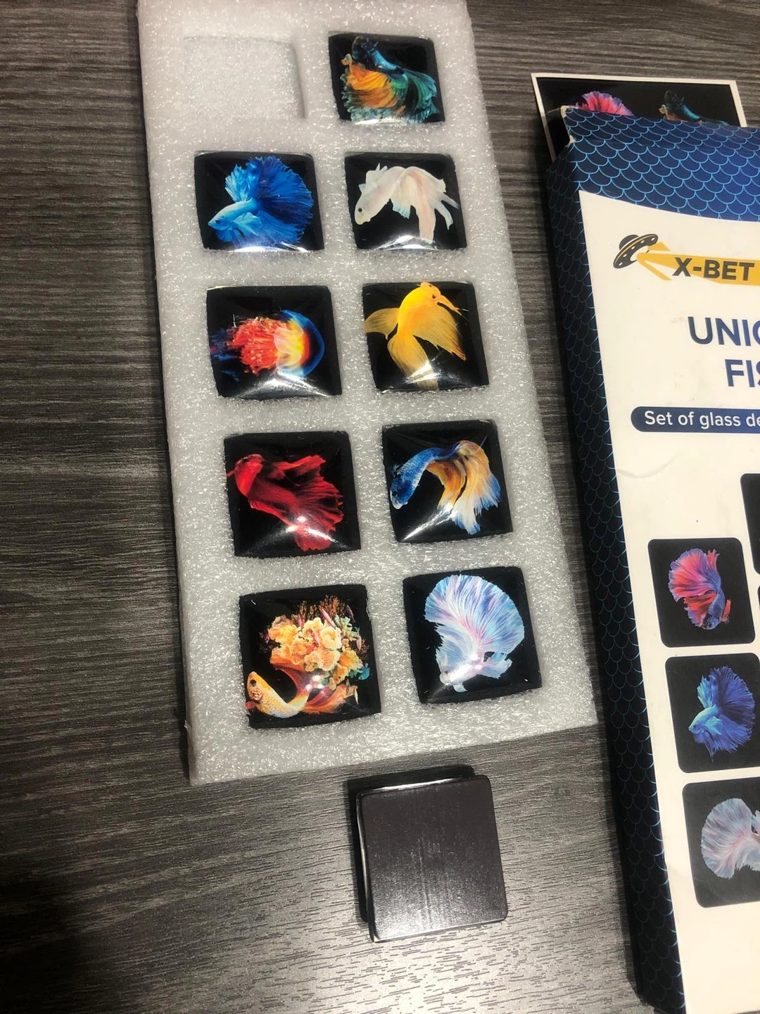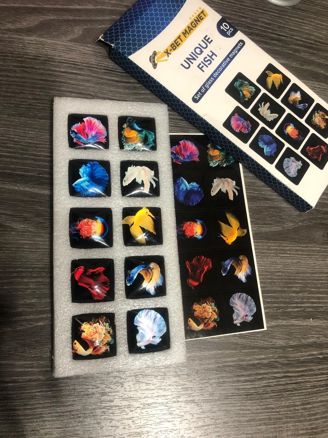 This is a set of 10 decorative magnets featuring unique fish designs. Each magnet is made of glass and showcases vibrant betta fish imagery. They're perfect for adding a splash of colour to any magnetic surface!