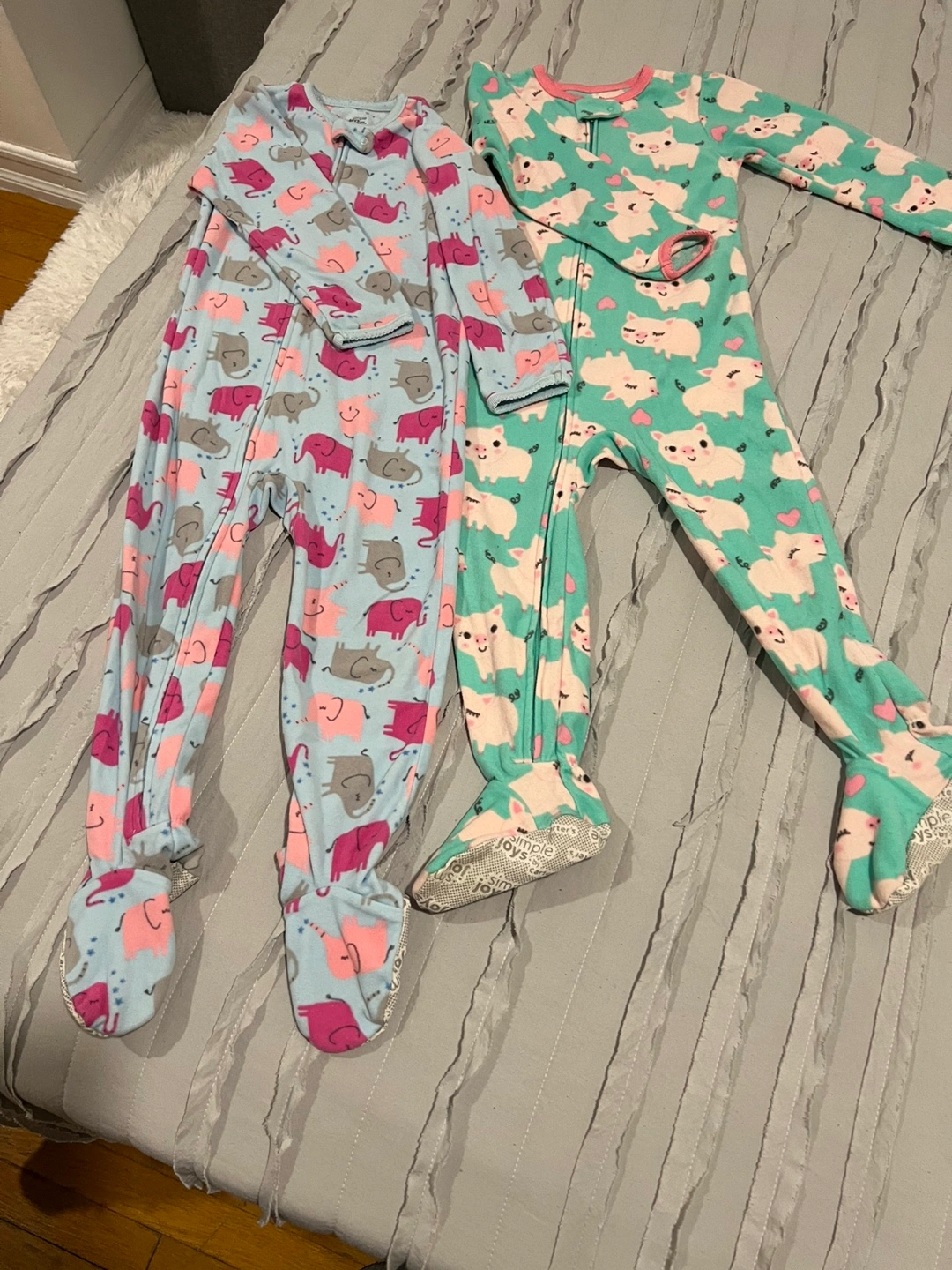 Adorable girls' pajamas. Two pairs of footed pajamas. One features elephants, the other features pigs. Soft and cozy material. Zip-up closure. Great for bedtime!