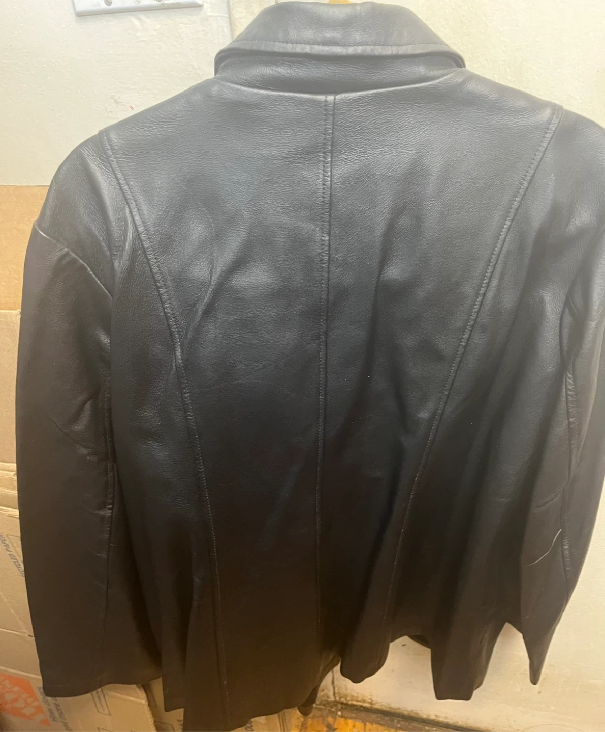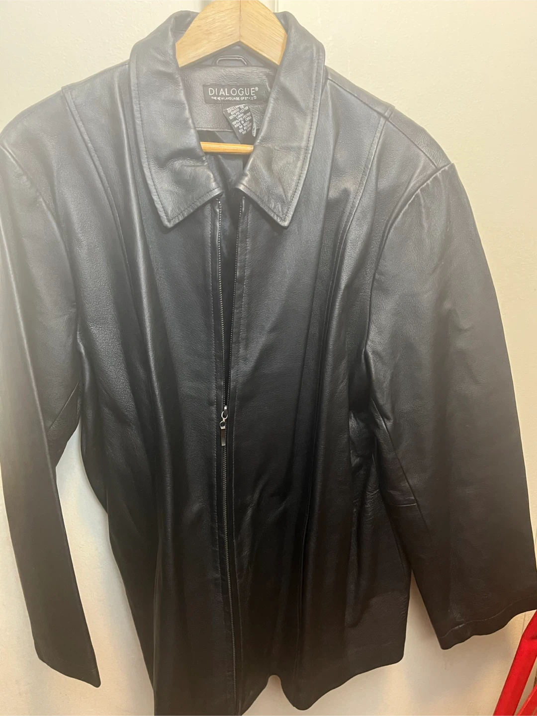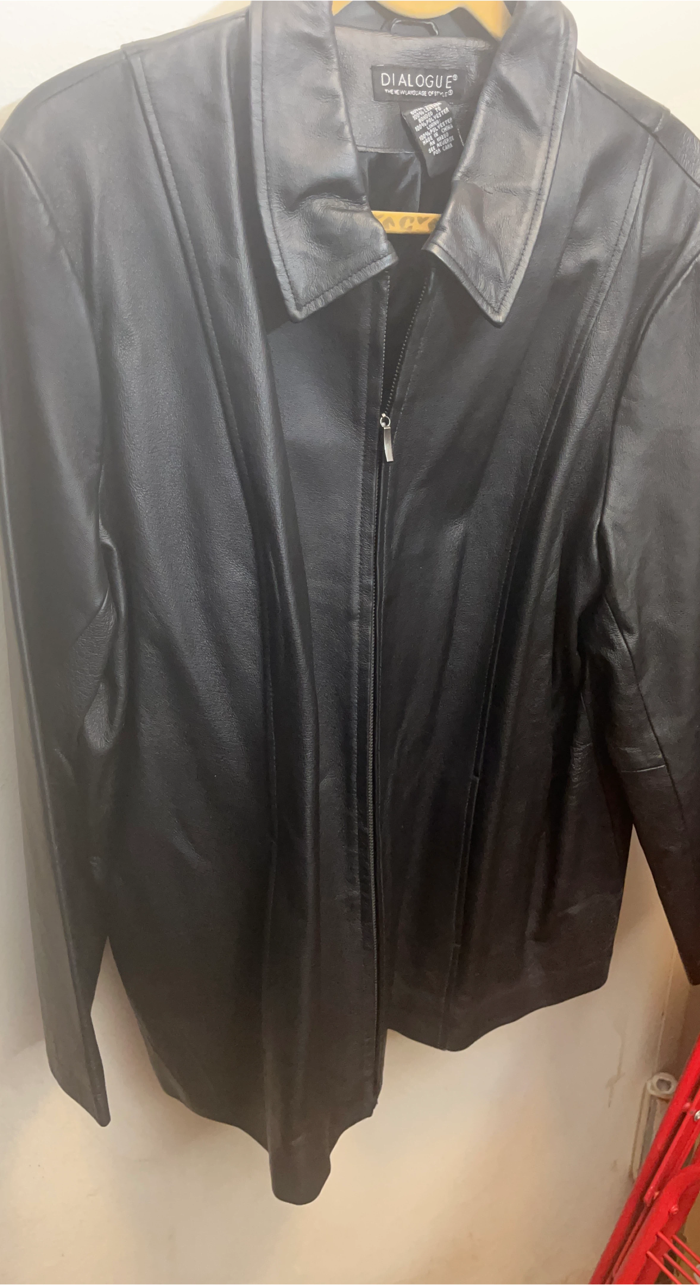 11Selling a black leather jacket from Dialogue. The outer shell is 100% leather bonded to 100% polyester, and the lining is 100% polyester