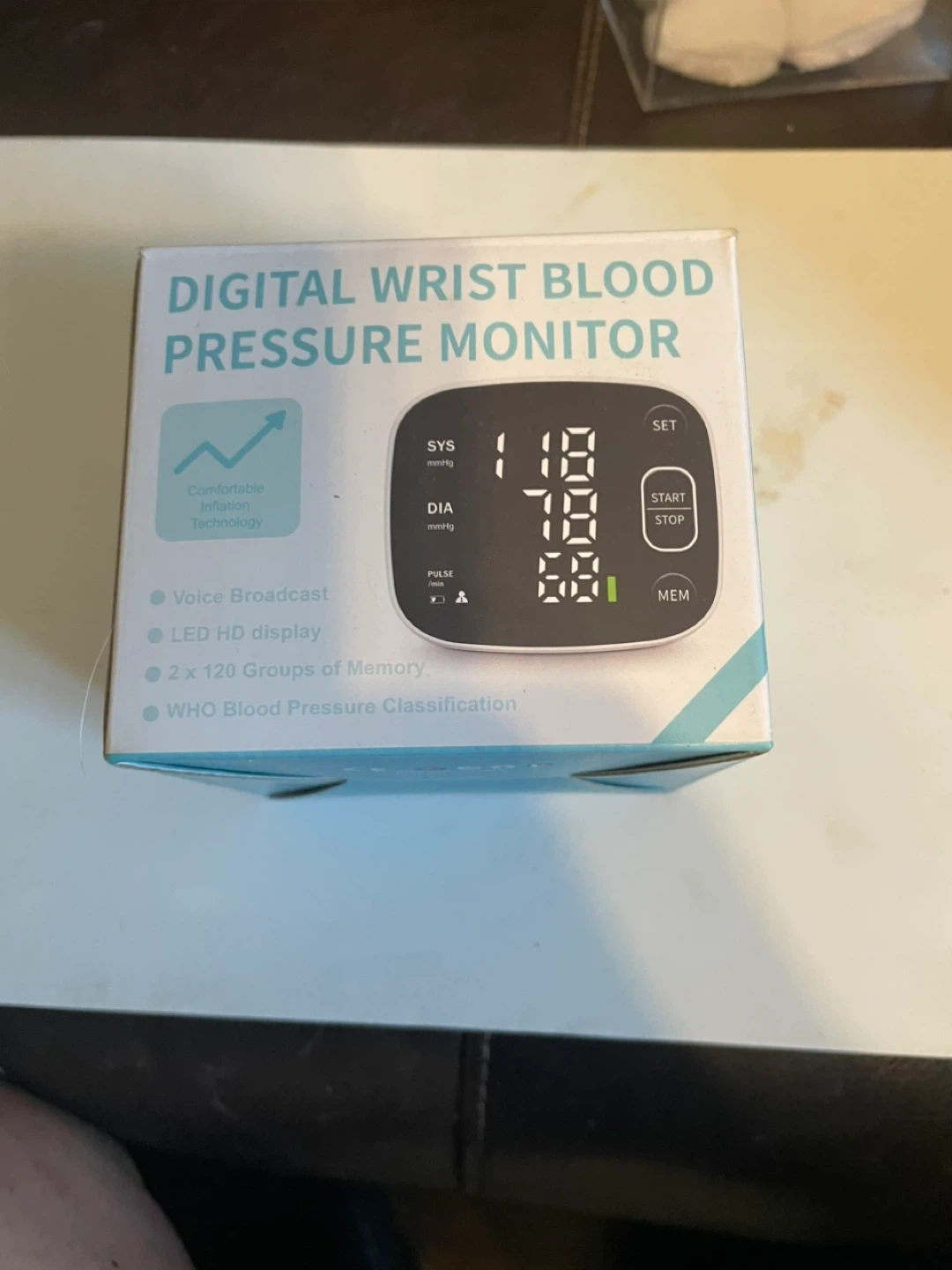 Selling a digital wrist blood pressure monitor. It features comfortable inflation technology, voice broadcast, and an LED HD display. It can also store 2 x 120 groups of memory and has WHO blood pressure classification. It comes with the box