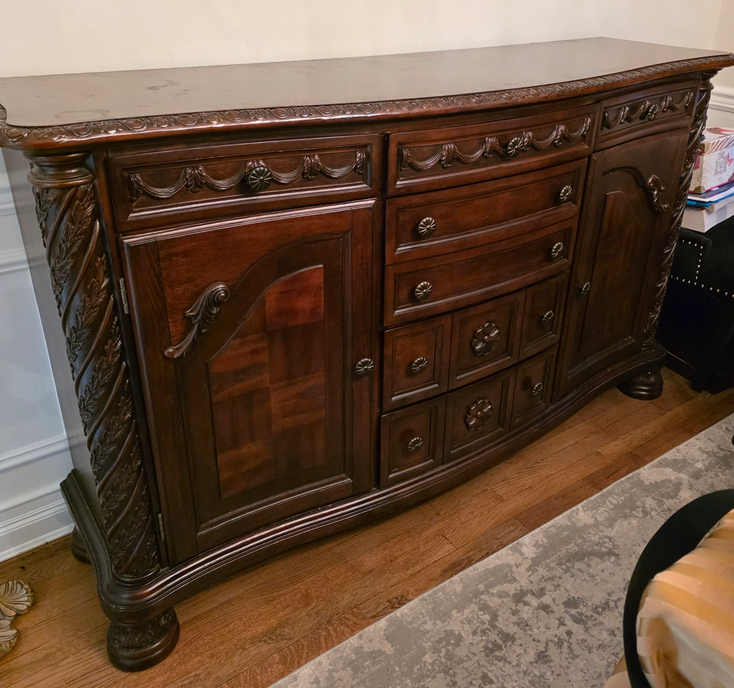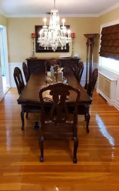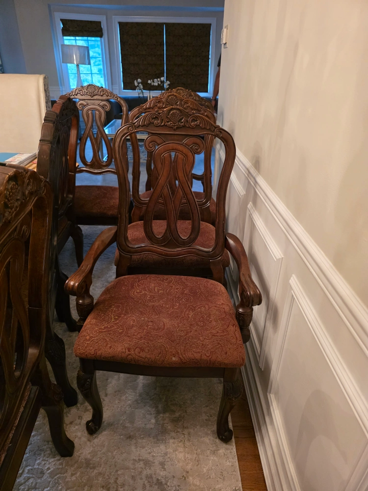Selling a beautiful dining room set that includes a table, eight chairs (2 arm chairs & 6 side chairs), and a buffet. The set is made of wood and has a dark finish. The chair seats are upholstered with a patterned fabric. It's a great set for family dinners or entertaining guests!