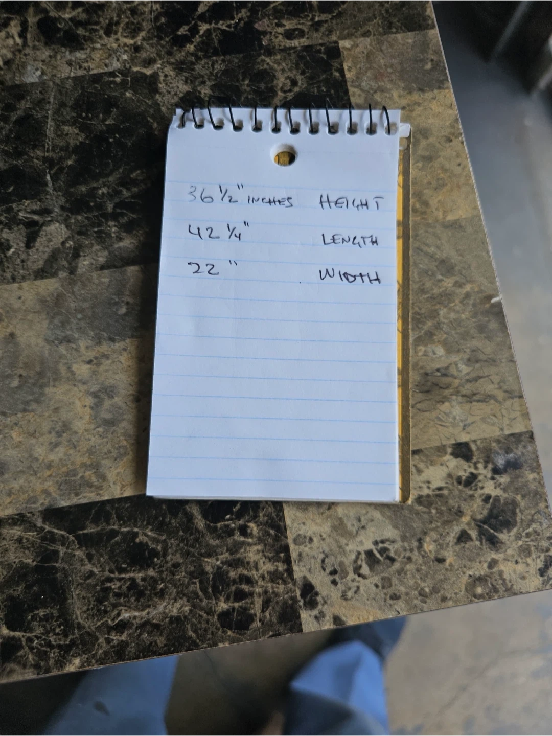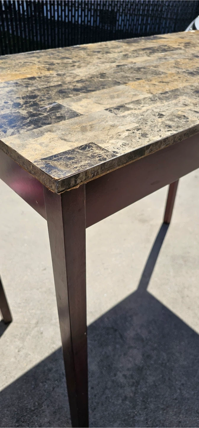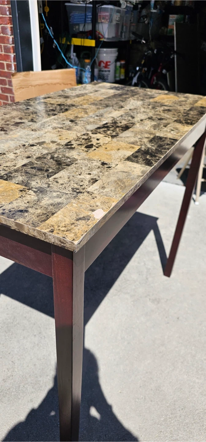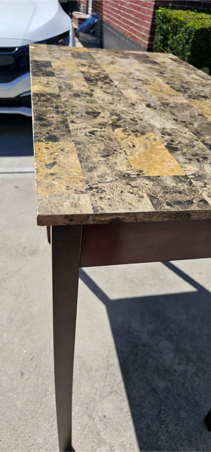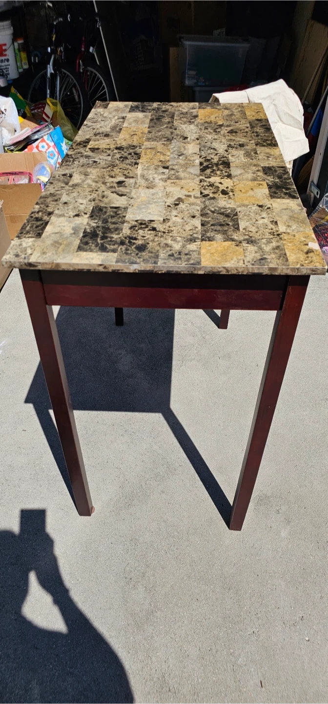 38I'm selling a dining table with a unique tiled top and dark wood legs. It's perfect for a small dining area or kitchen nook. The table measures approximately 42 1/4 inches in length, 22 inches in width, and 36 1/2 inches in height