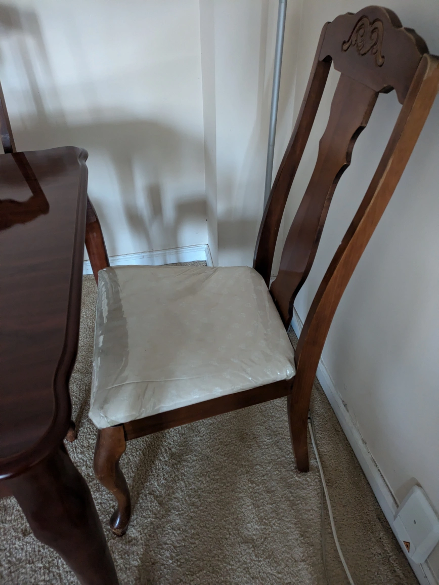 Wood dining table with 6 chairs. Table top has a slight rounded edge. Chairs have a carved design on the back. Includes a white cushion. Some minor wear on chairs. The table was kept covered with tablecloth at all times and shines like new. This is in a pet free, smoke free home.