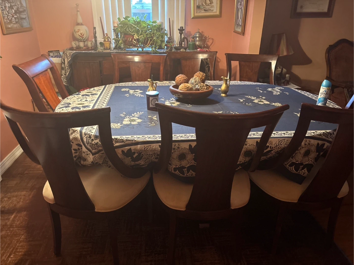 10Selling a dining table set that includes six chairs. The table is covered with a blue floral tablecloth. The chairs appear to be made of wood with light-colored seats. Perfect for a family dining room!