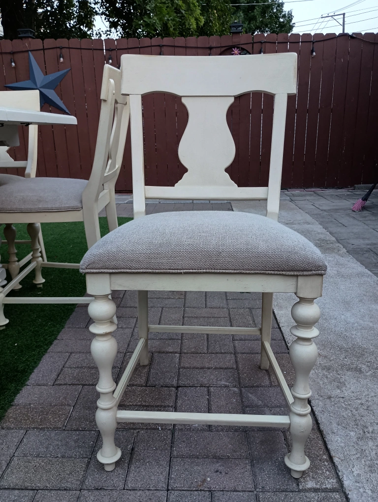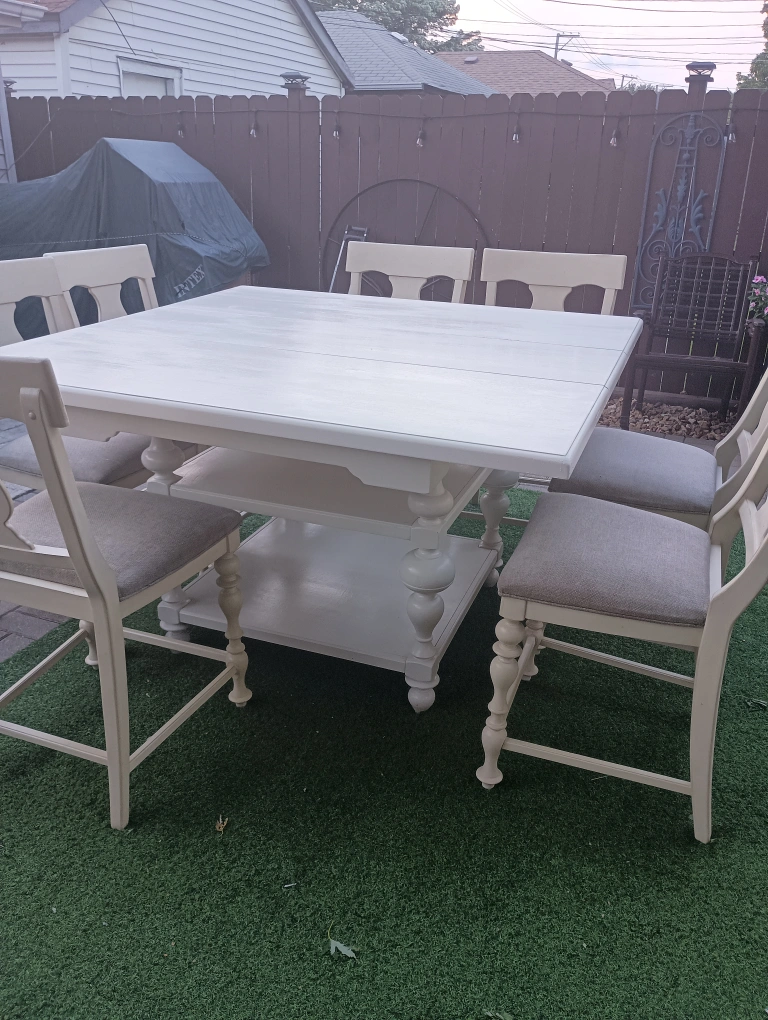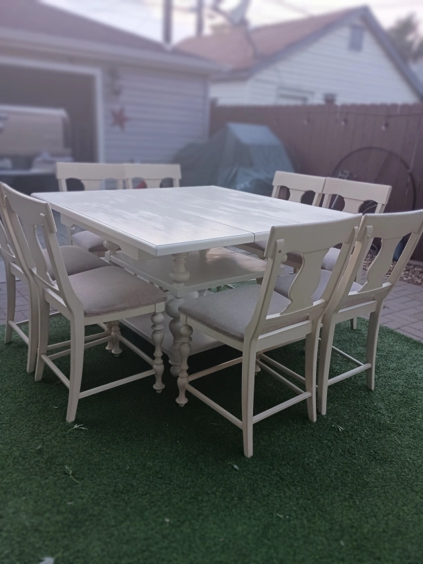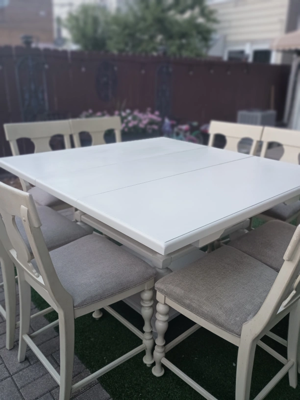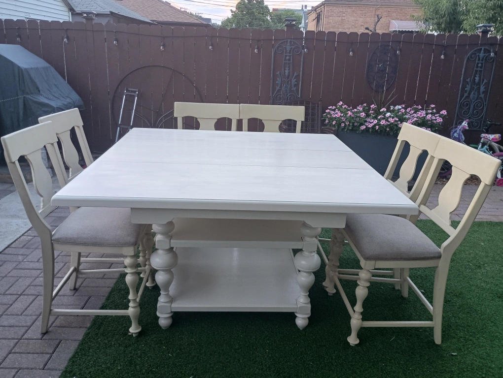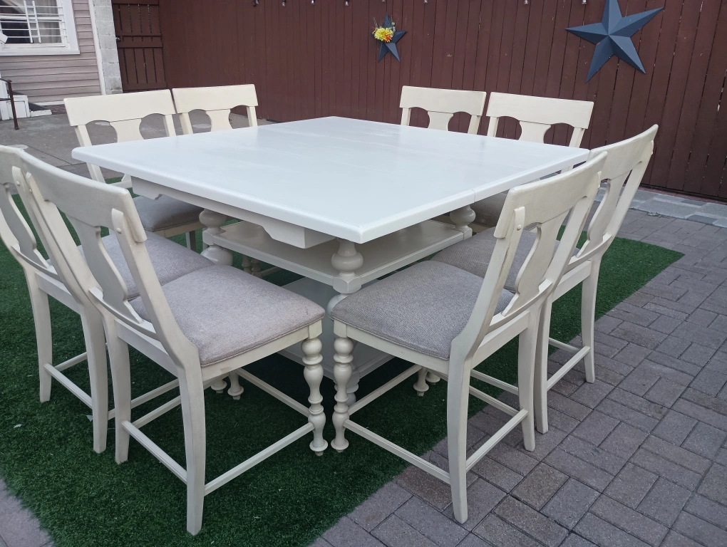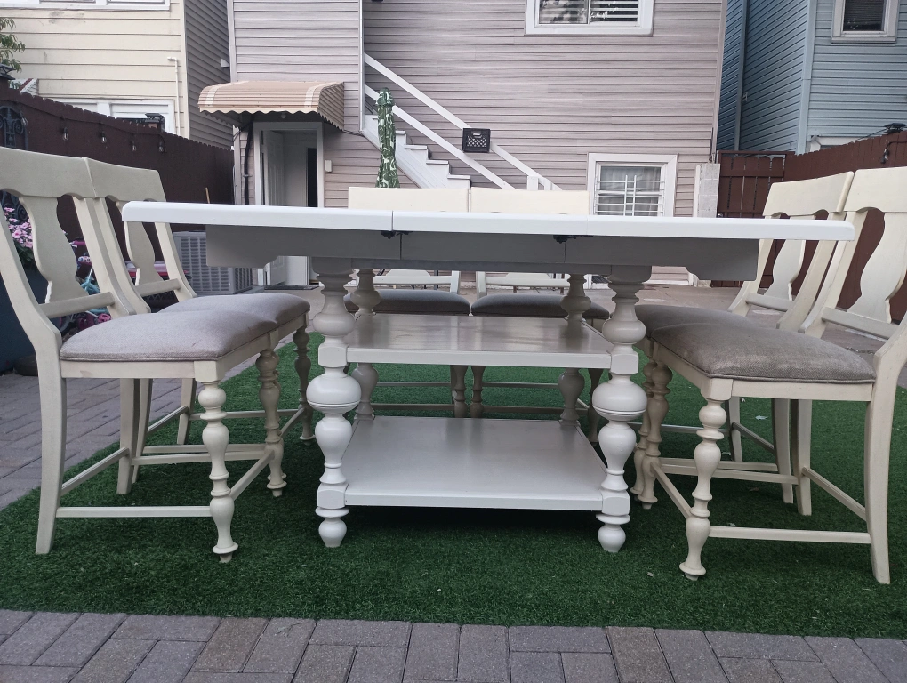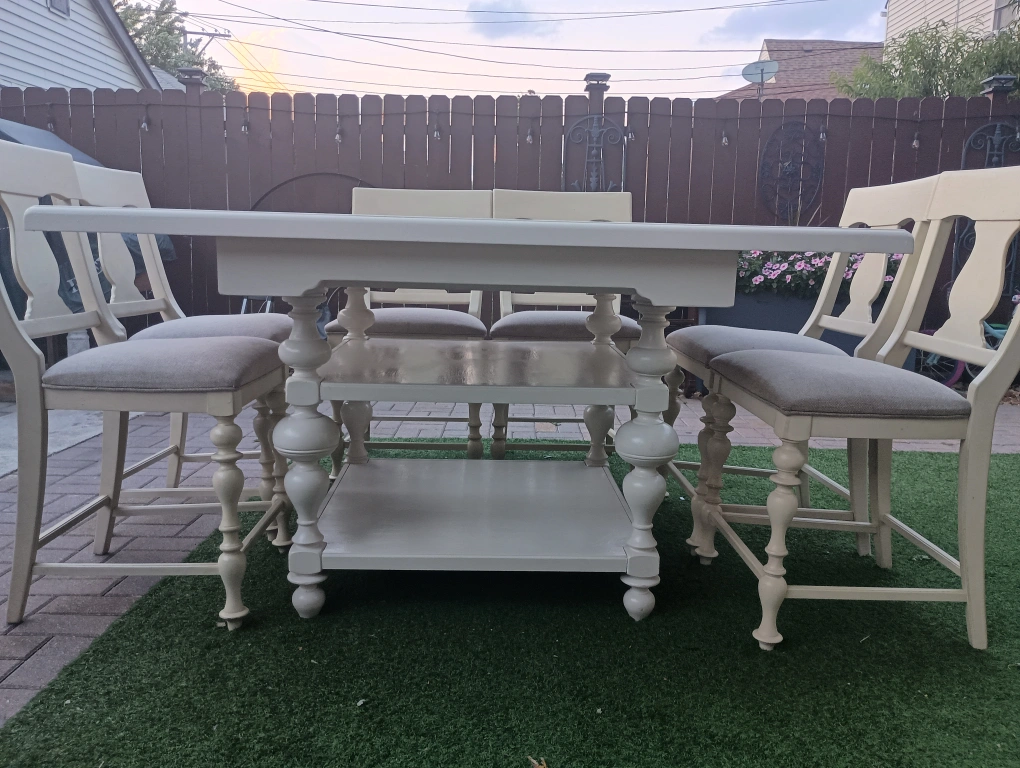 Cream-colored dining table set, including 8 chairs. The table features a unique design with a central pedestal and a built-in shelf for storage. The chairs have cushioned seats for added comfort. This set is perfect for family meals or entertaining guests! can take out leaf and make it to 6 chair
