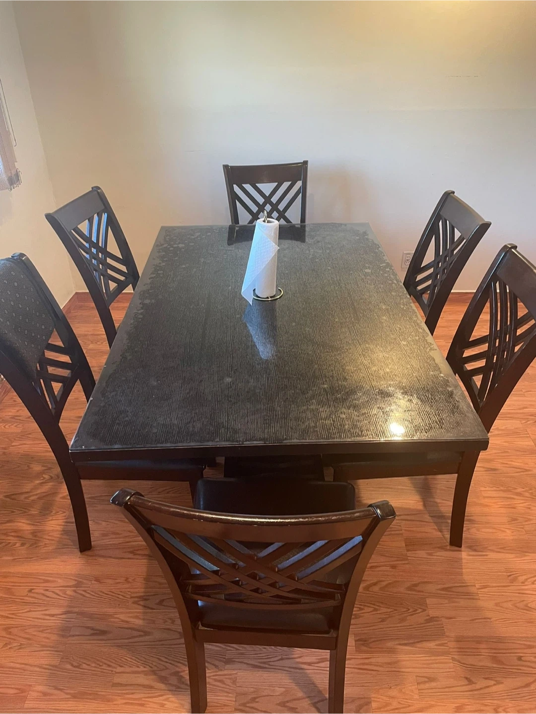 Selling a dining table with six chairs. The table is a dark color and the chairs have a unique design on the back. It’s in great condition and ready for a new home