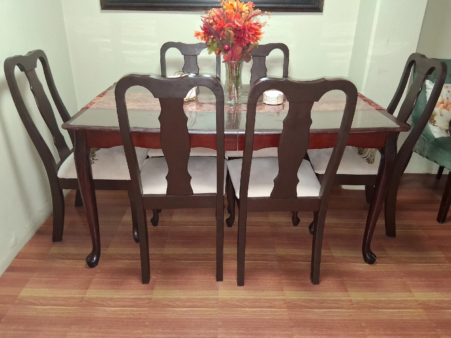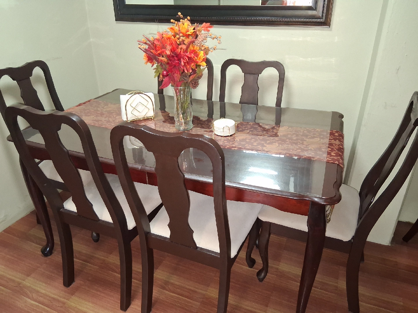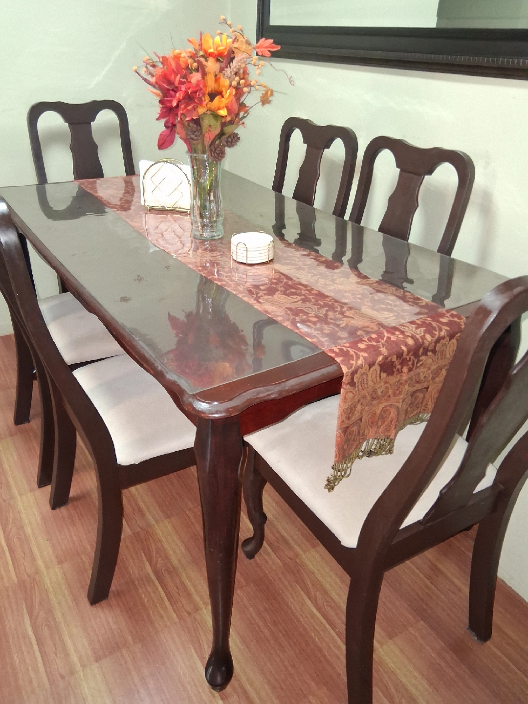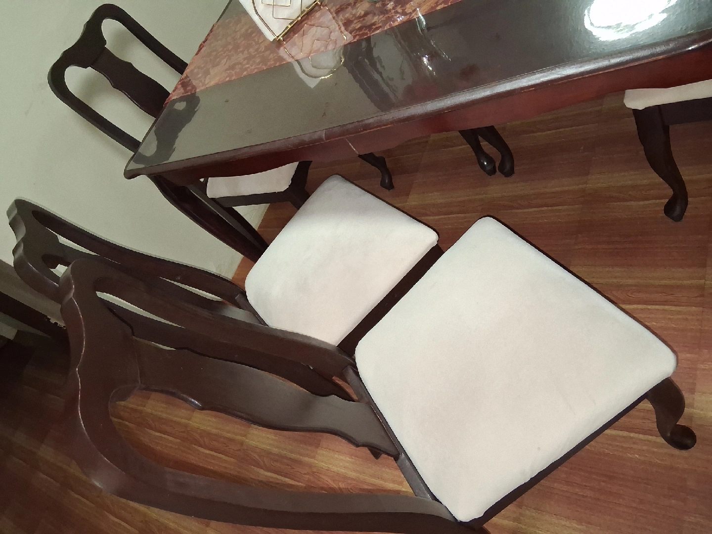 Selling a dining table set that includes six chairs. The set features a dark wood finish and chairs with light-colored cushioned seats. It's perfect for family dinners or entertaining guests!