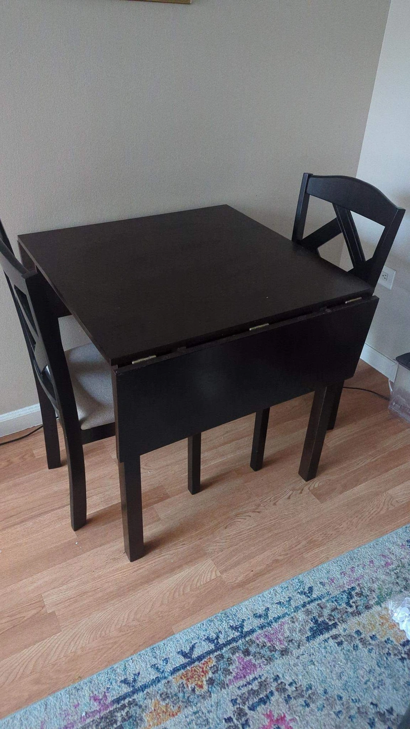 79Moving sale! Dinning table with two collapsible leaves in good condition. Good for seating 2-6 people Bought new in 2022 for $570. Chairs included. Pick up any day between October 29 and November 3.