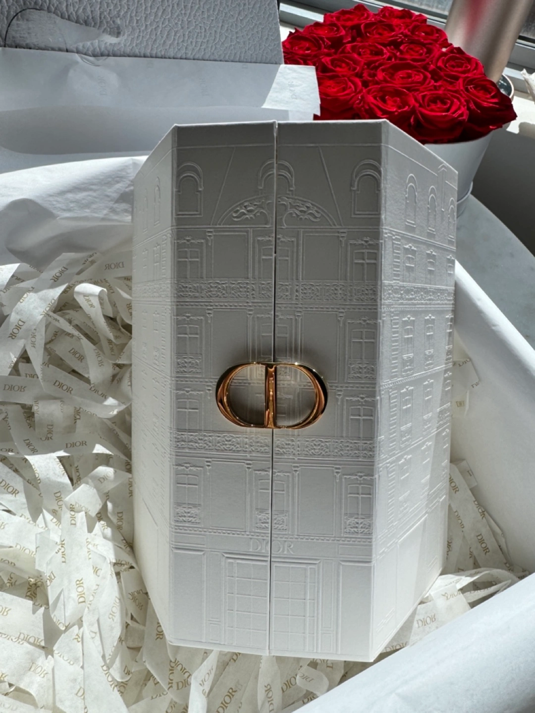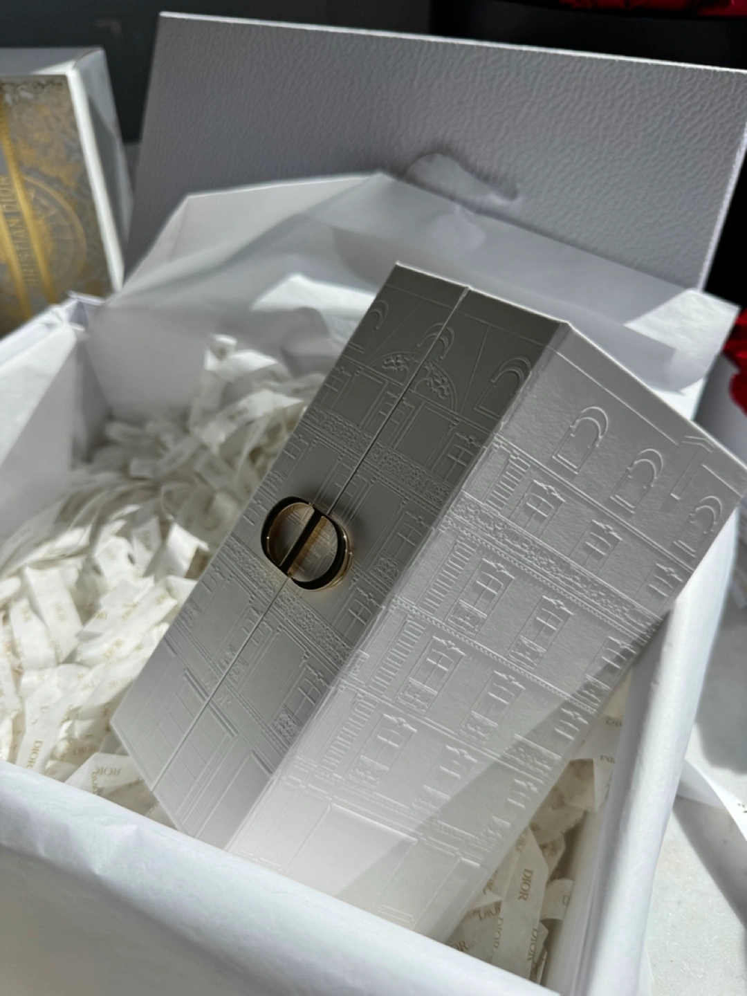 White hexagonal box. Exterior with embossed details. Gold-tone hardware. Great storage for small items, which can bring a sense of peace.