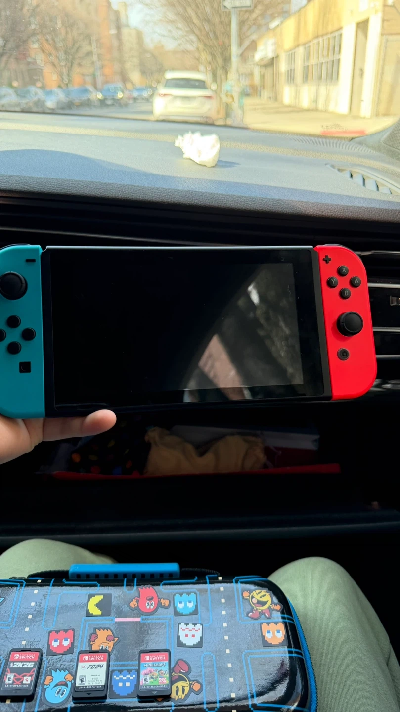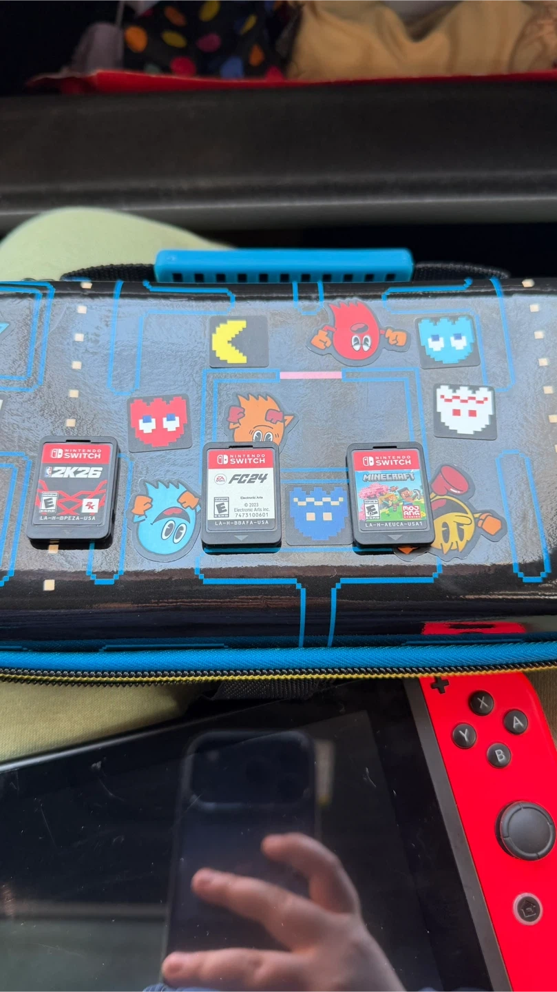 This is a Nintendo Switch console with neon red and blue Joy-Cons. It comes with a Pac-Man themed carrying case and several games: Mario Kart 8 Deluxe, F-Zero 99, and Super Mario Odyssey. The console and accessories are in good condition.
