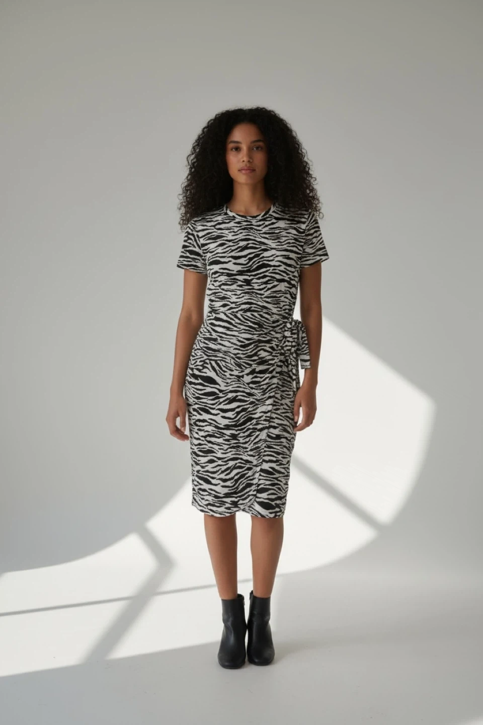 Cute dress with a zebra print! It's a stylish piece that would look great for a casual day out or dressed up for an evening event. The wrap style and tie detail add a flattering touch to the silhouette