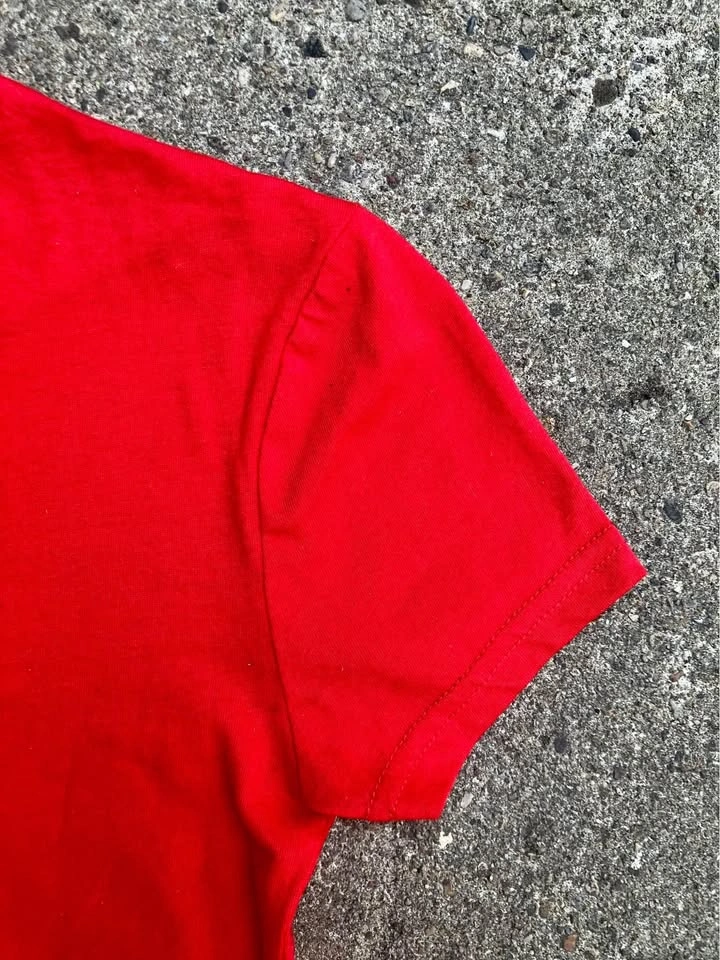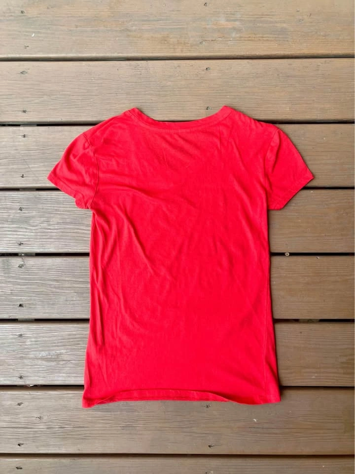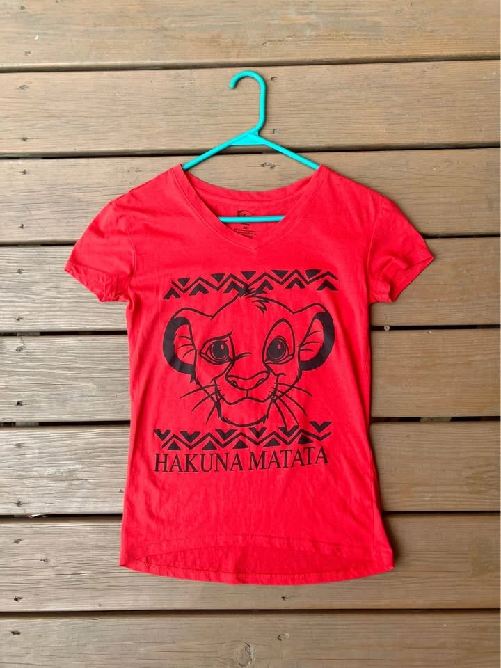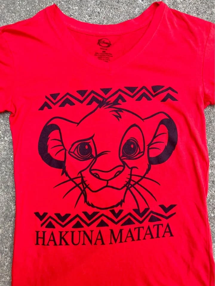 Red “Hakuna Matata” cap sleeve tee from the Lion King. It’s an adult size XS worn once, in like new condition. 60% cotton and 40% polyester construction. When laid flat, shirt measures 25” from top of shoulder to waist and is 16” across under the arms. From a smoke and pet free home. Check out in person before purchasing. Thanks for looking.