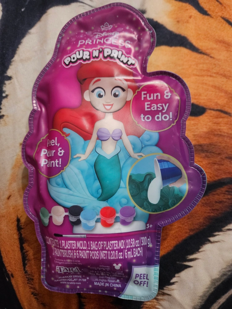 87Get creative with this Disney Princess Ariel Pour n' Paint kit! It includes a plaster mold, a bag of plaster mix (10.58 oz / 300g), a paintbrush, and 6 paint pods (net 0.20 fl oz / 6 mL each). It's fun and easy to do! PICK UP ONLY