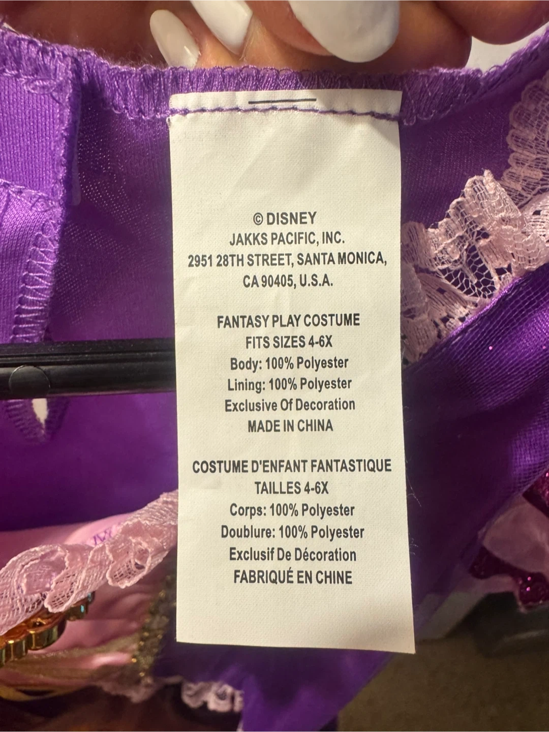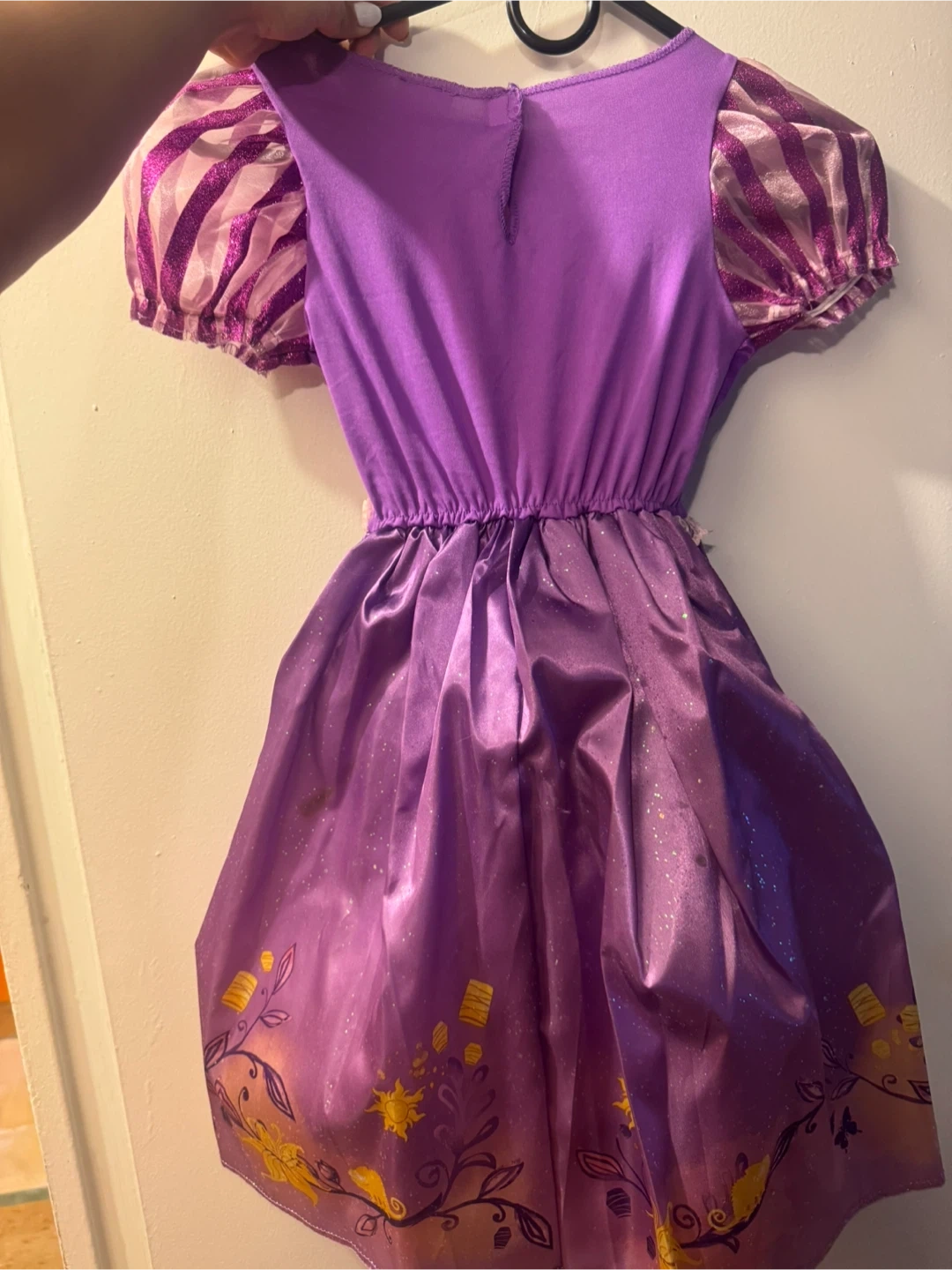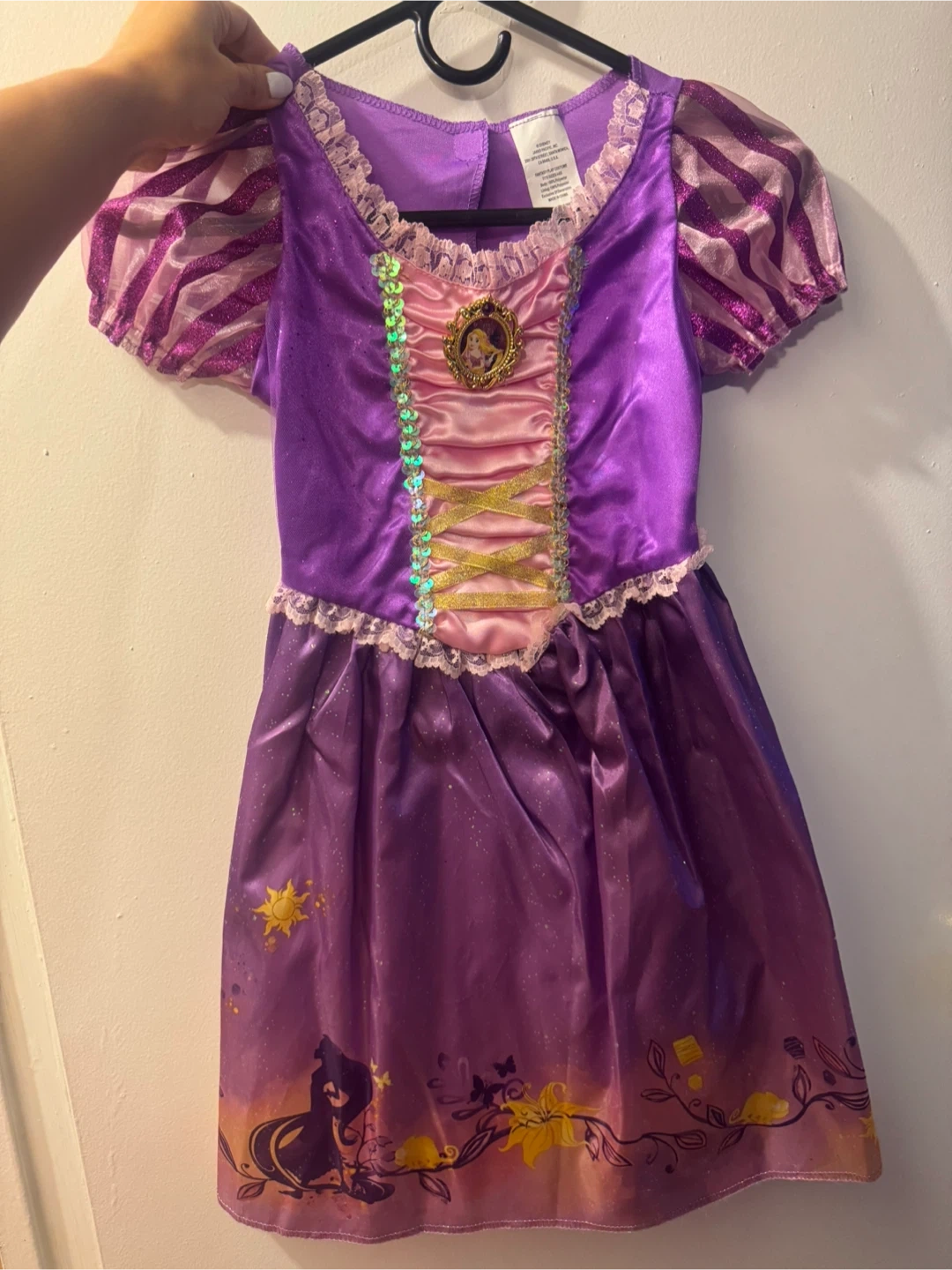 60Selling a cute Disney Rapunzel costume, perfect for dress-up or Halloween! It fits sizes 4-6X and is made with 100% polyester. The costume features a pretty purple design with glittery accents and details from the movie Tangled