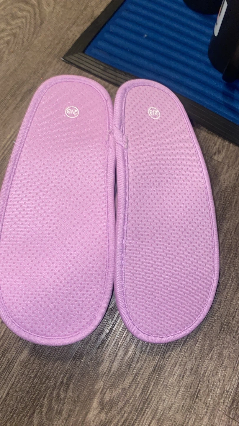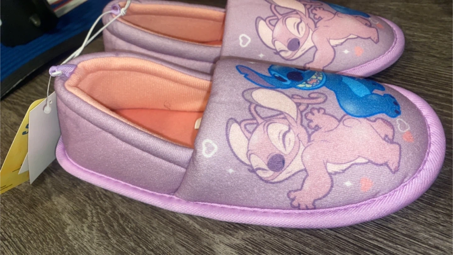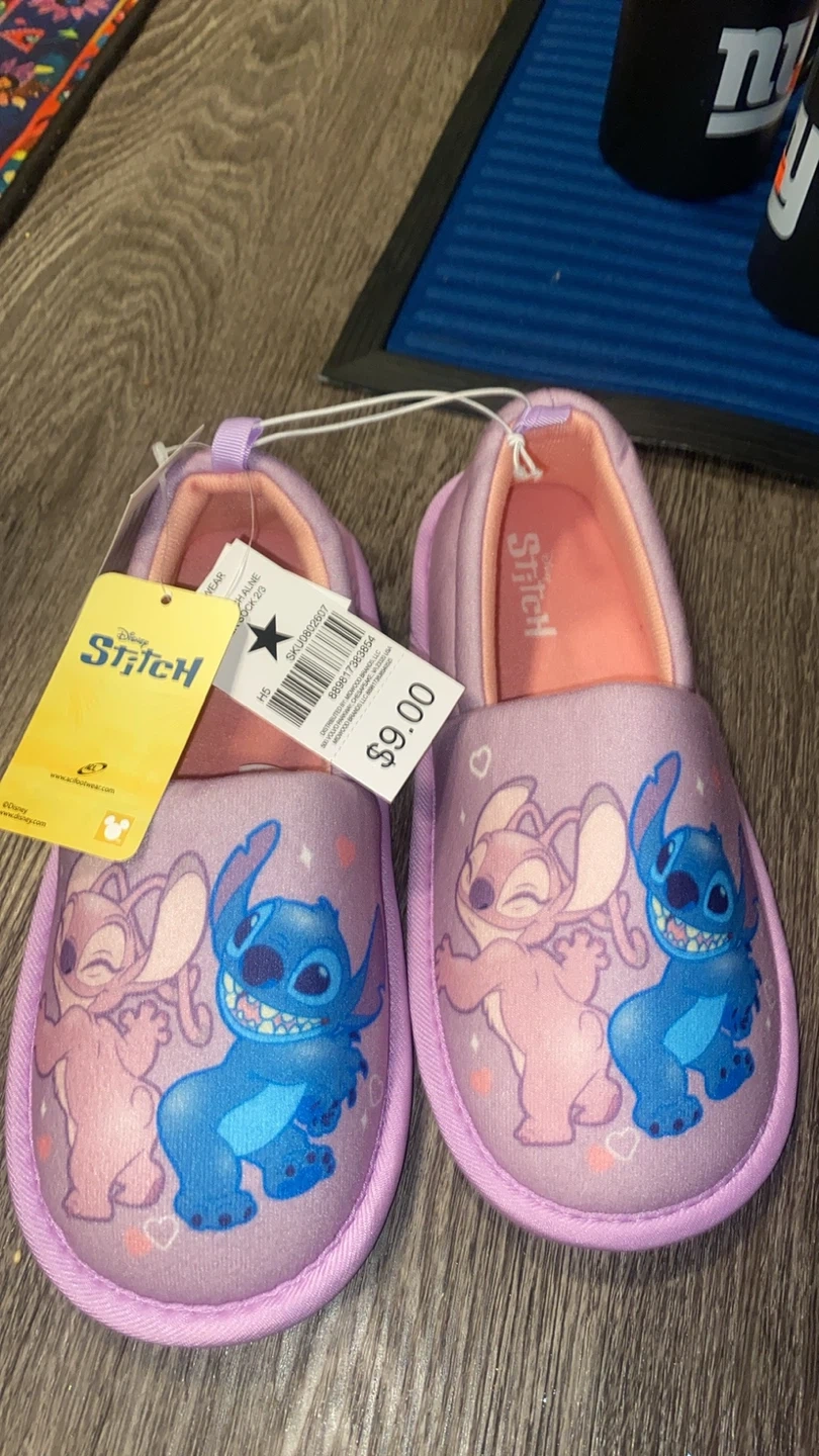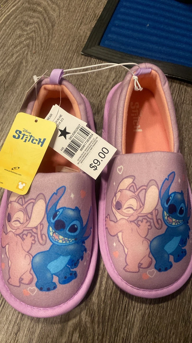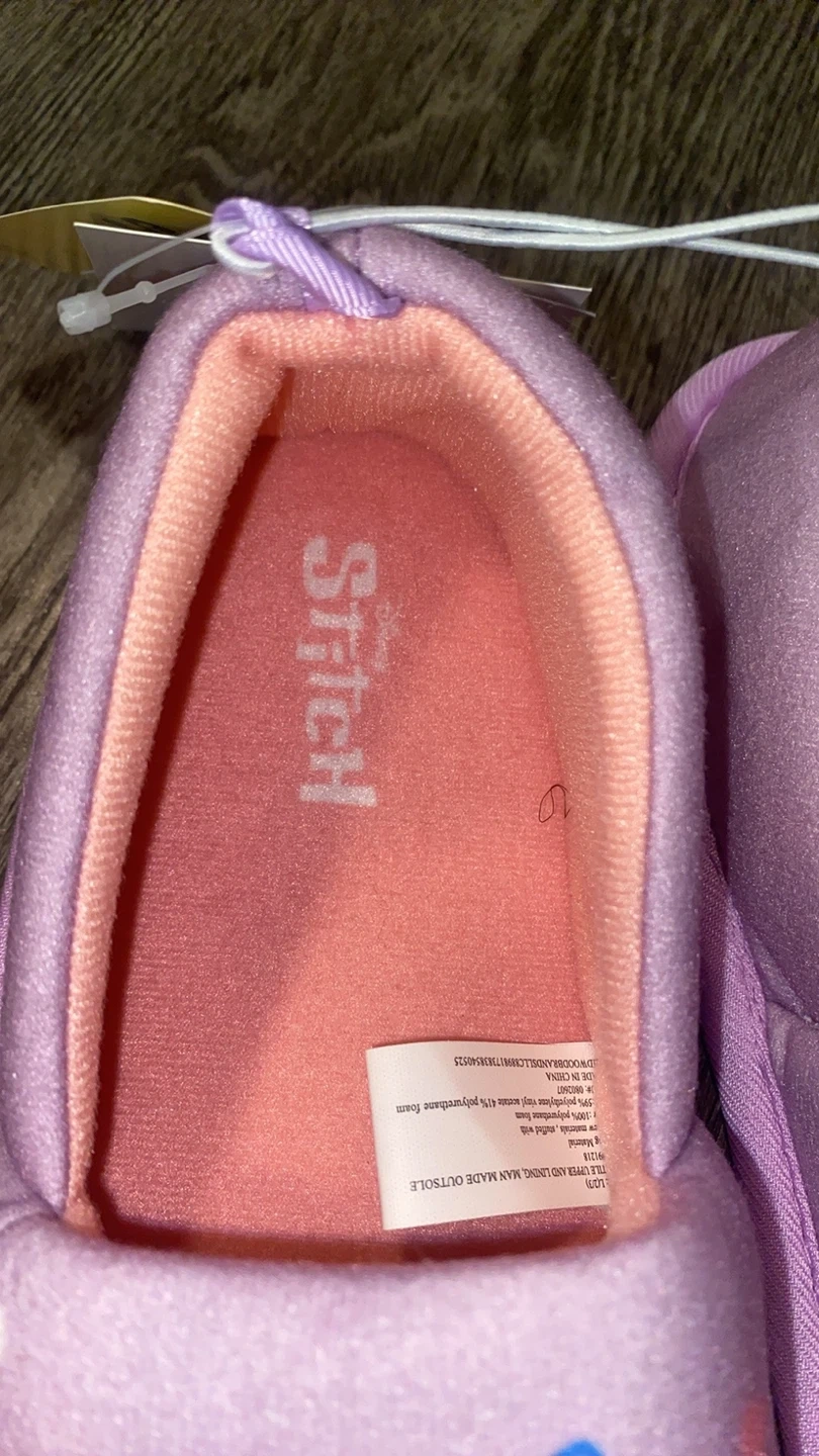 These adorable purple Disney Stitch slippers feature characters Stitch and Angel. They're made with a soft polyester upper and a flexible polyurethane foam sole. The size is 2/3.