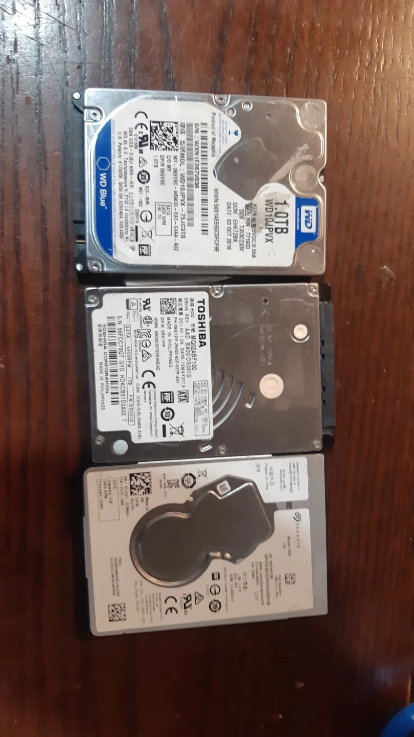 This lot includes three hard drives. One is a Toshiba 1TB drive, and two are Western Digital drives, one 1TB and one 500GB. These are internal 2.5-inch drives. They're suitable for laptops or external storage projects. They have Wimdows 10 install PM them so plug it in and turn on you compute Stone church and Upper Paradise