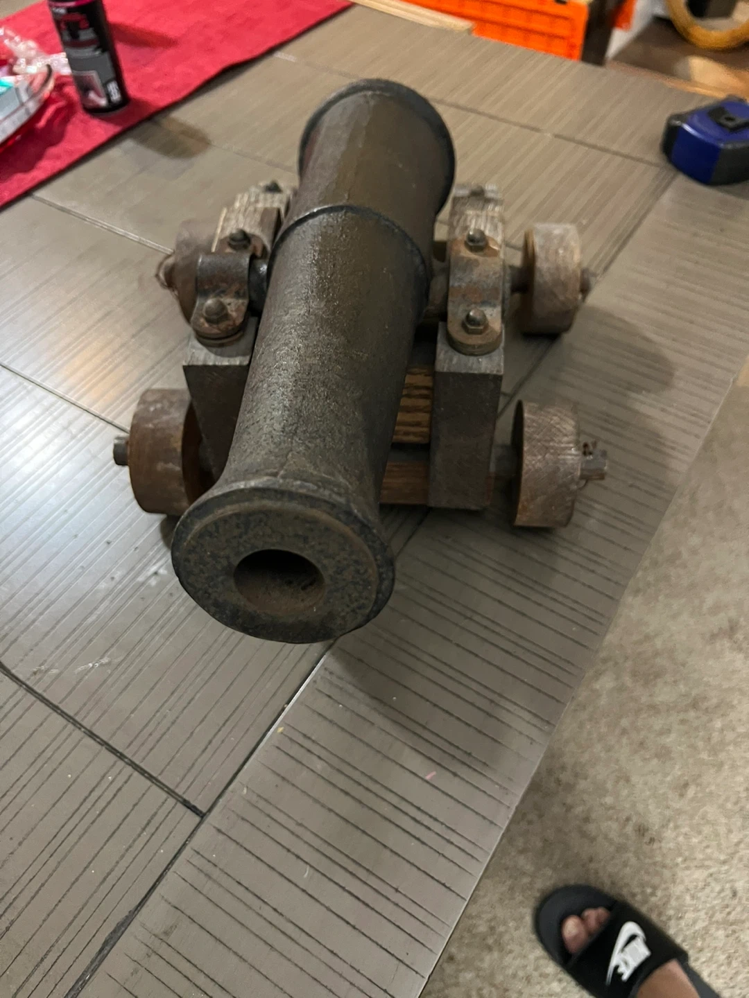 This is a antique decorative cannon with a dark metal barrel and a wooden base. It features wooden wheels and metal accents. It's a unique piece for display.