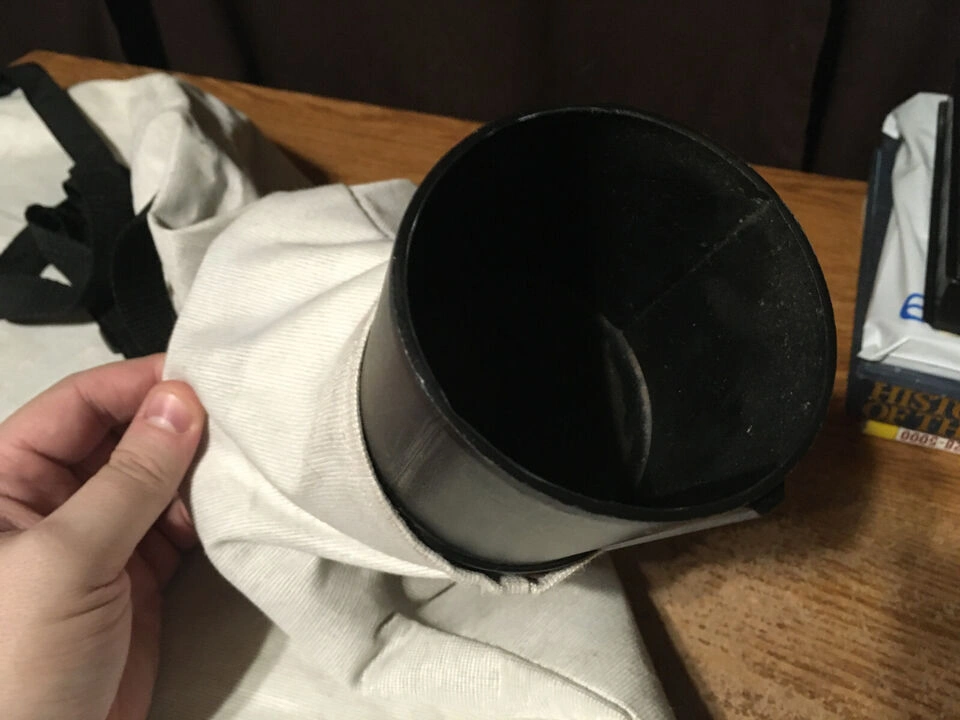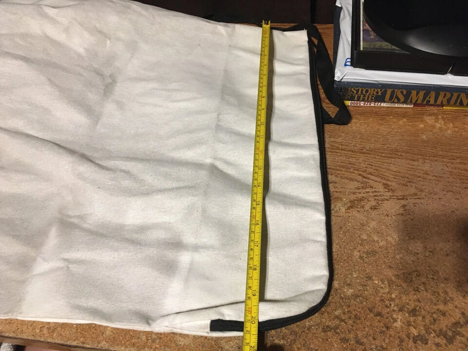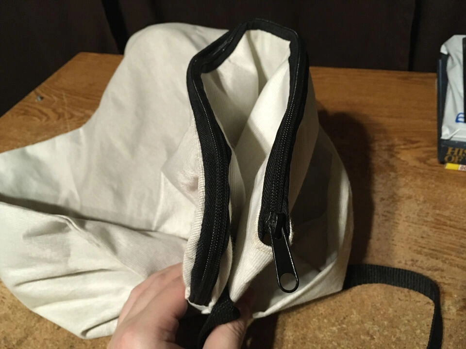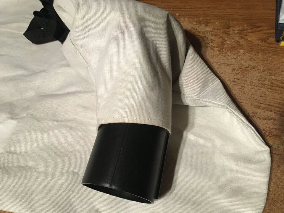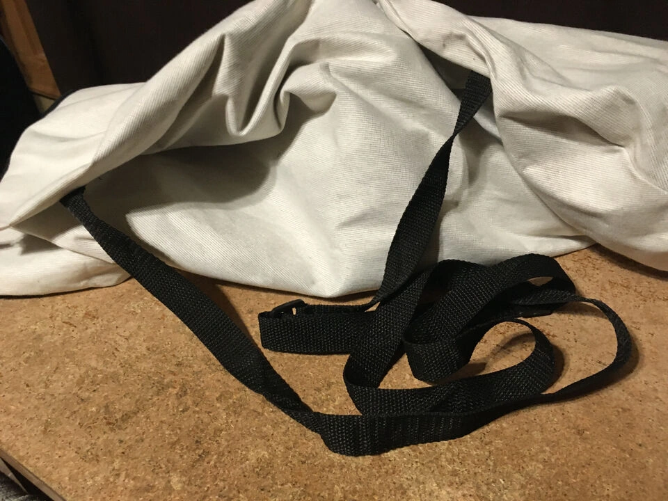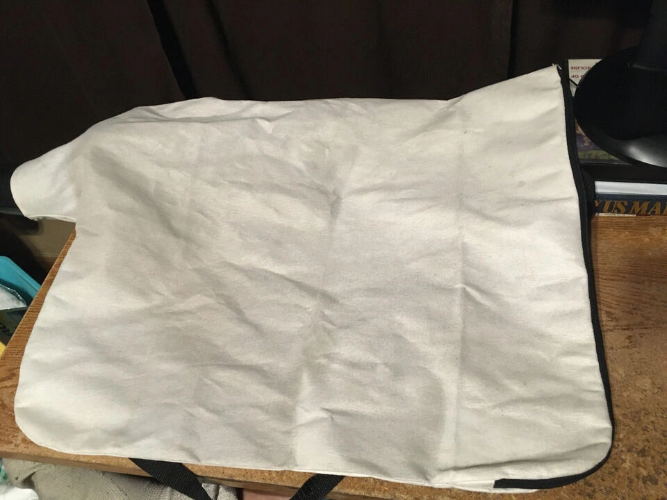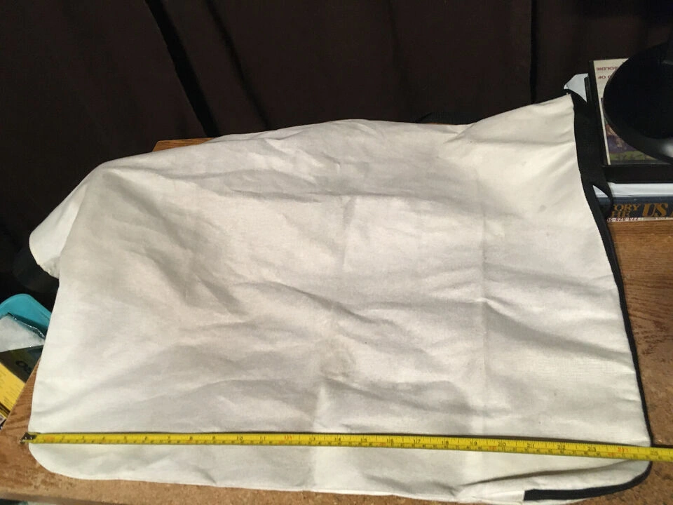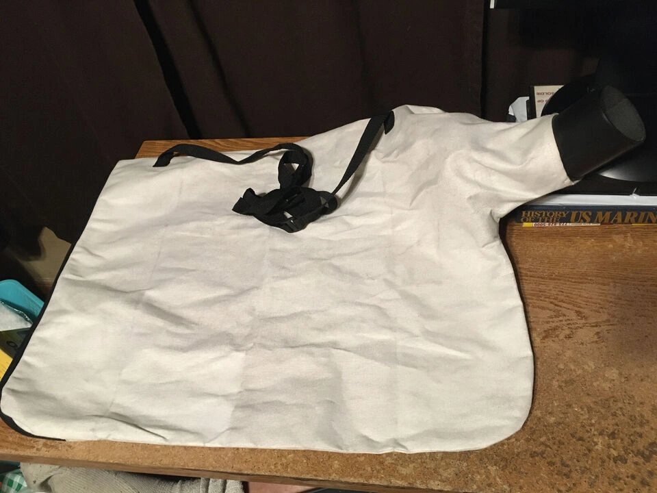 White canvas leaf blower vacuum collection bag. Features adjustable shoulder strap. circular attachment just under 3 in Good for collecting leaves and debris.