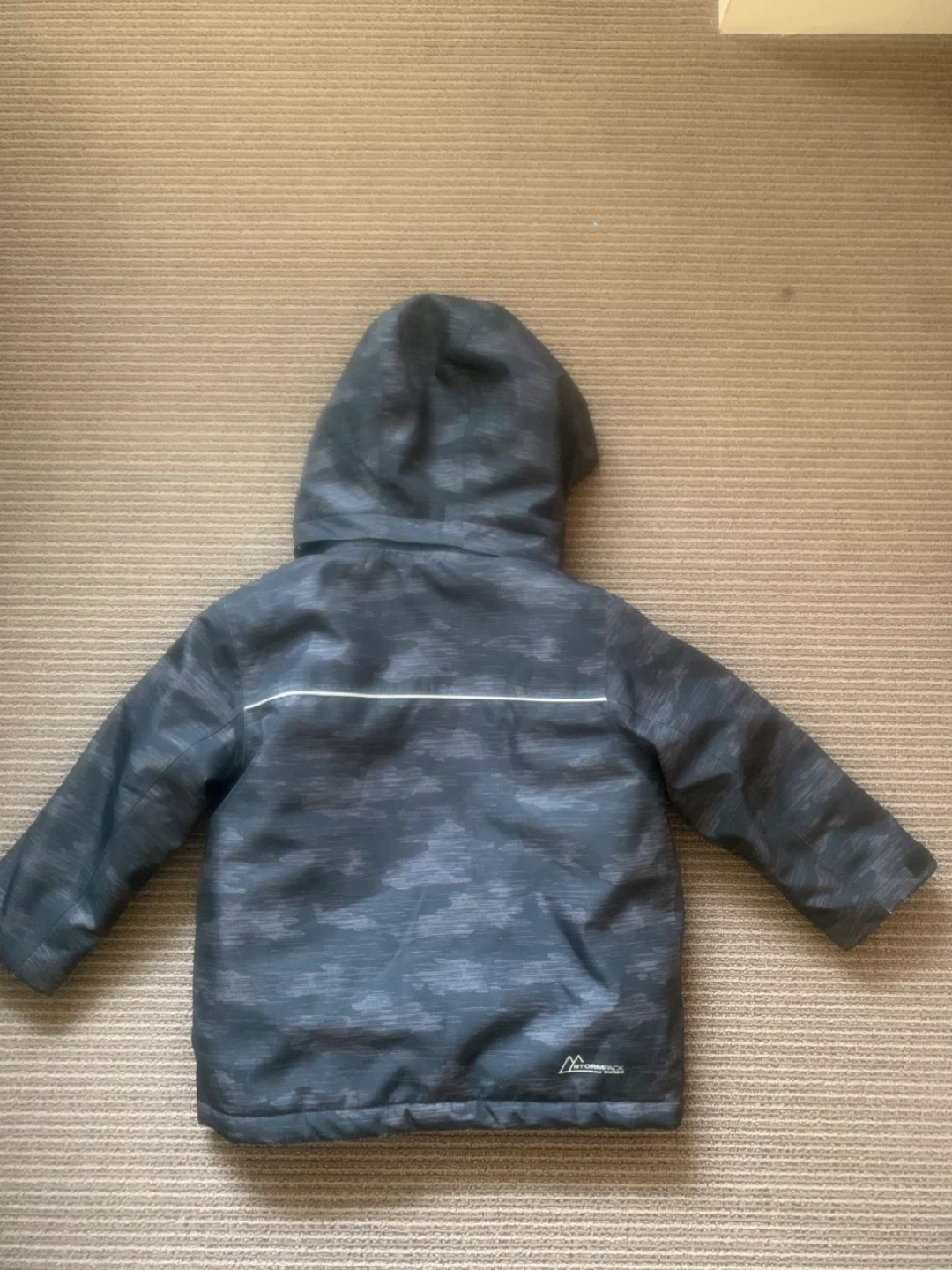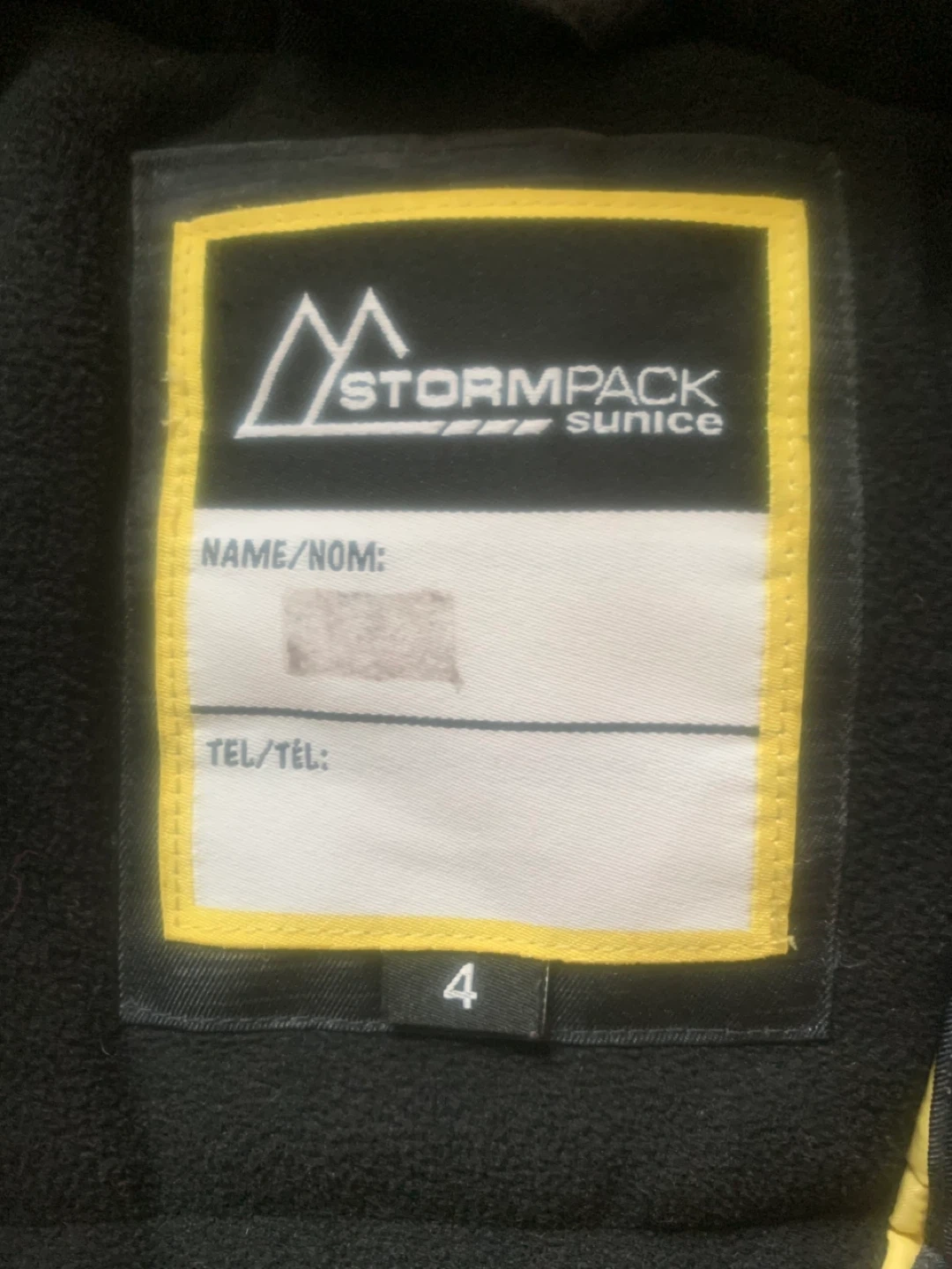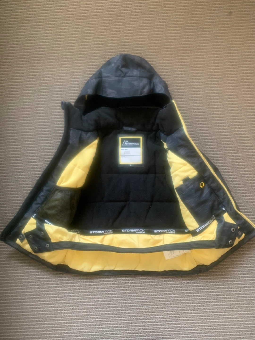 Stormpack Sunice kids' winter jacket! It's a size 4 and features a black and grey camo pattern with bright yellow accents.