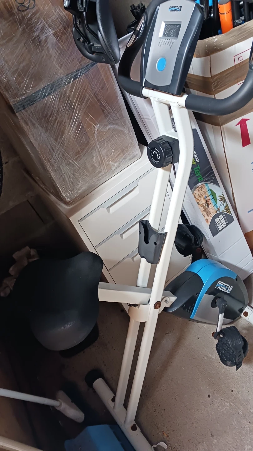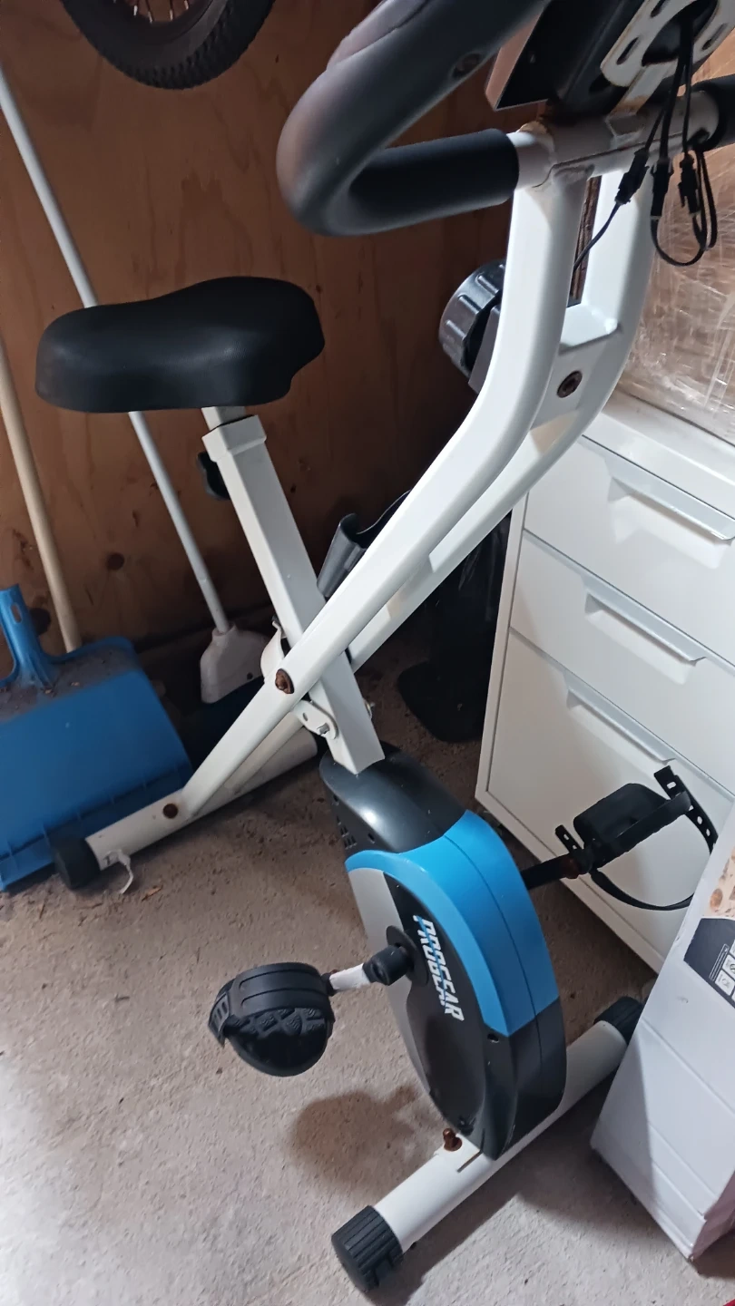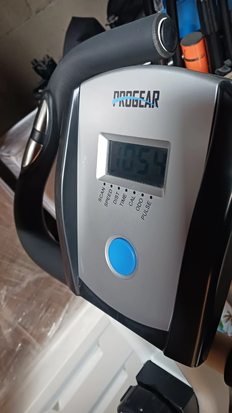 This is a ProGear exercise bike. It features adjustable tension control for your workout. The console displays scan, speed, distance, time, calories, and pulse. It's a great way to get a workout in at home!