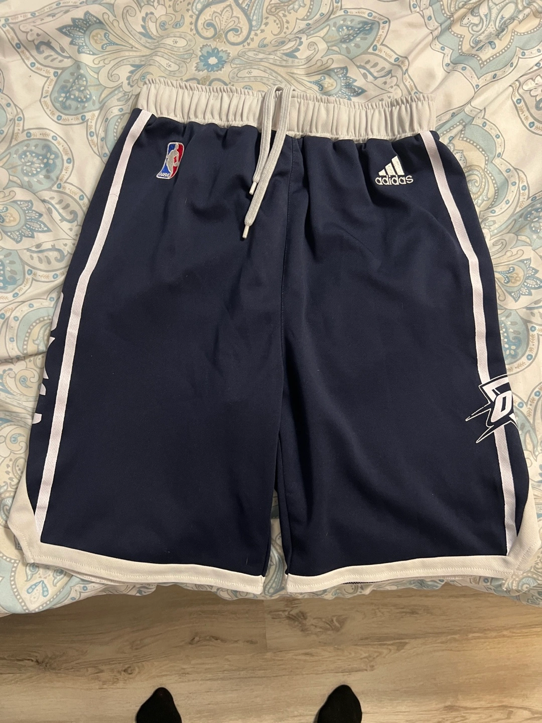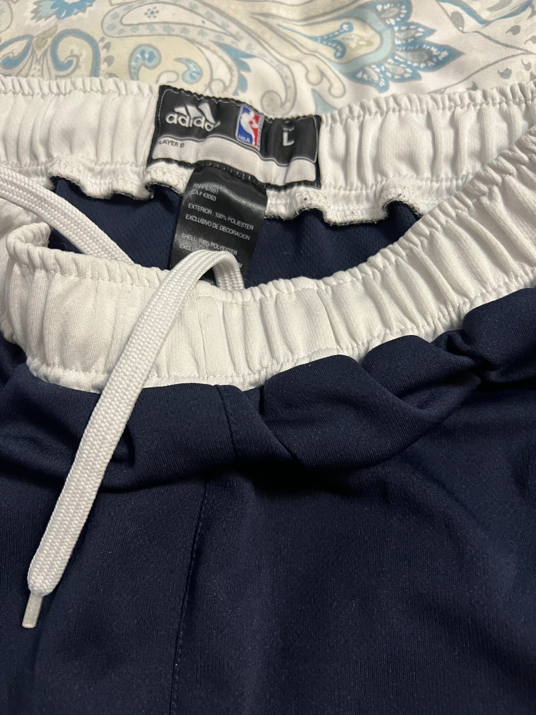 These are navy blue Adidas basketball shorts. They're a size youth large and made of 100% polyester. They have white trim and an elastic waistband with a drawstring. From smoke free home. Please check my other posts.