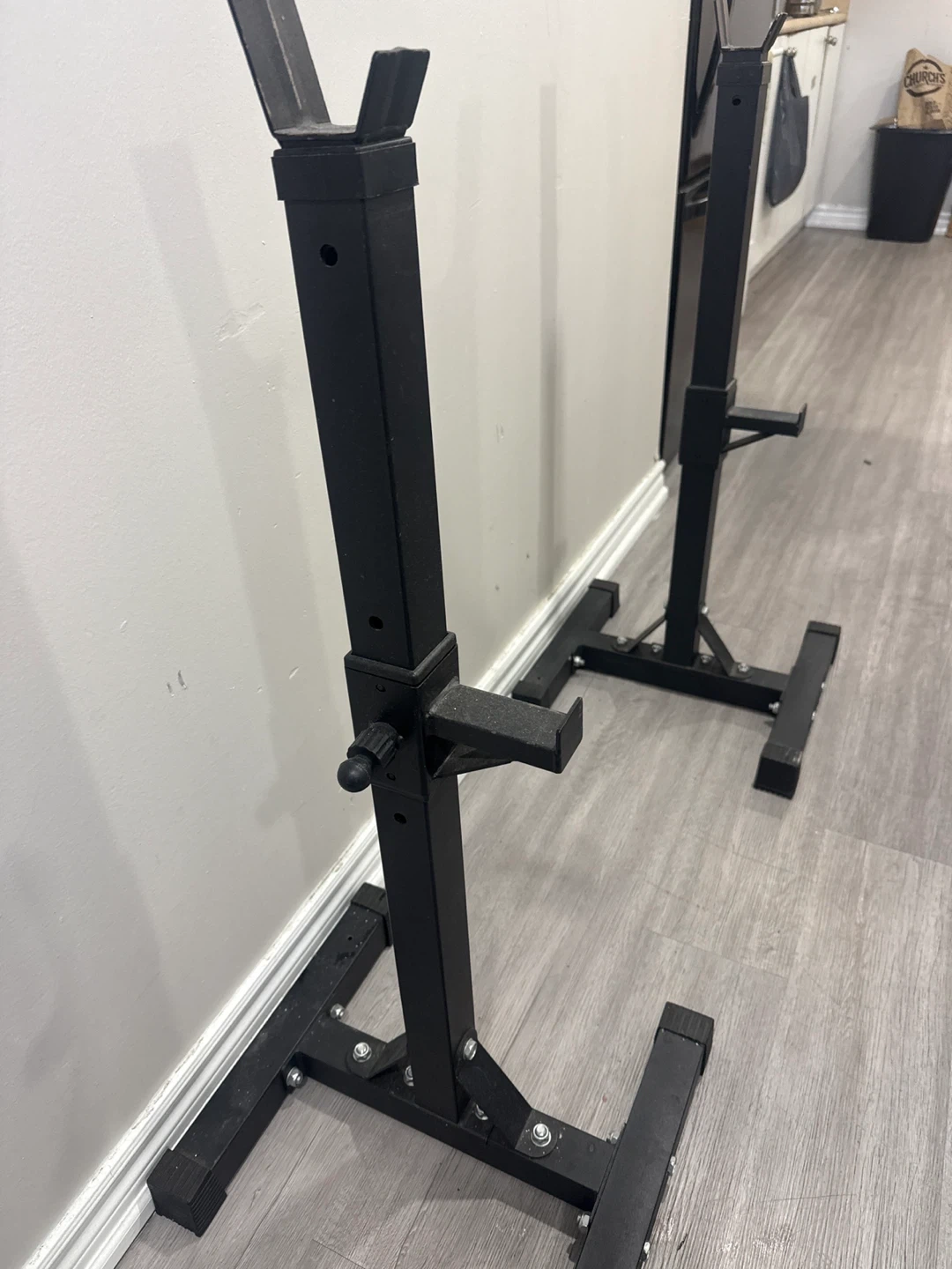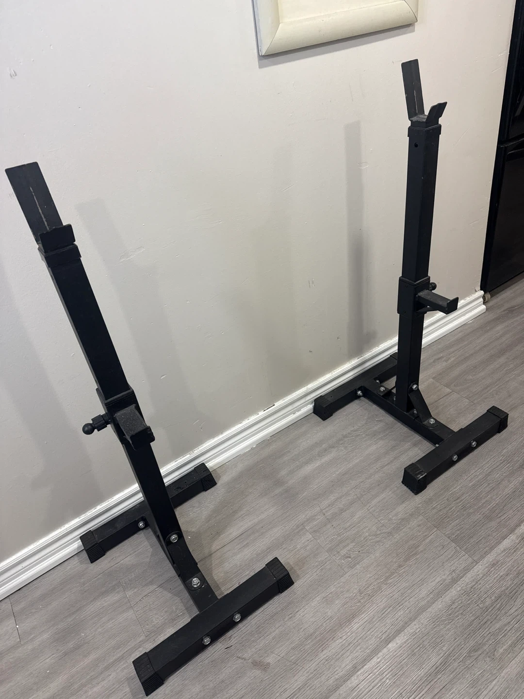 This pair of squat stands is designed for home gyms. It's made of durable black metal and features adjustable height settings. These stands are great for bench presses and squats.