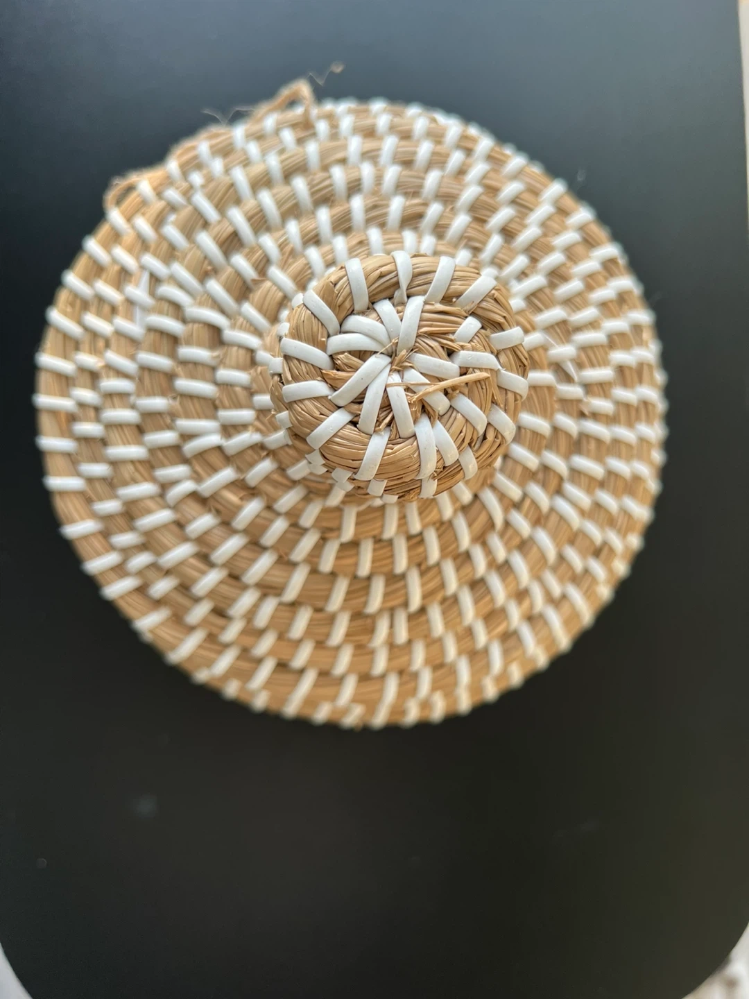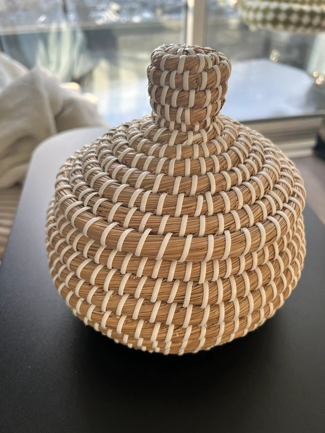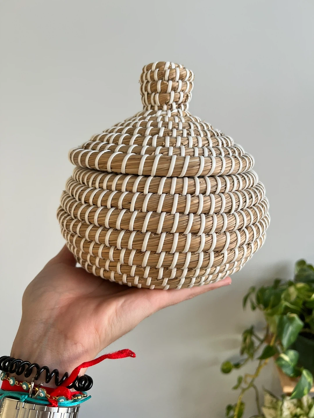 Selling a lovely small woven storage basket with a lid. Features a beautiful "coil" design in natural straw and white.