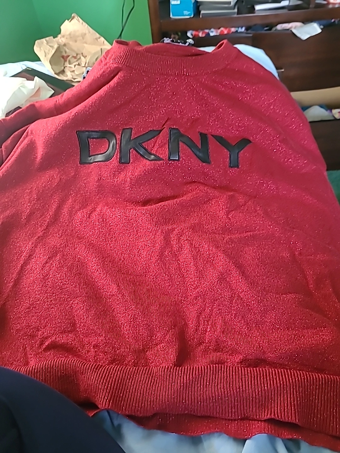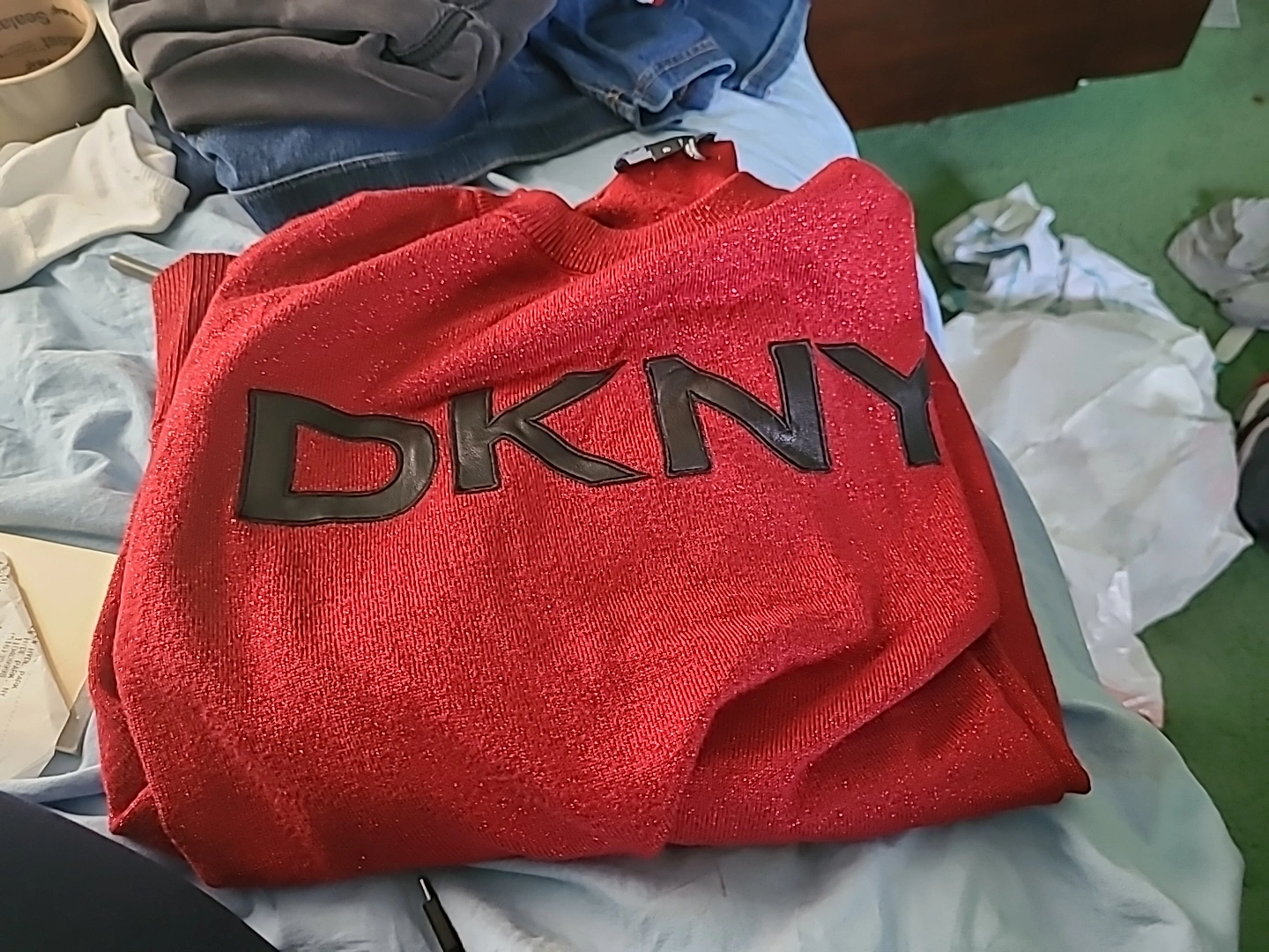 Selling a DKNY red sweater in size XL. It features the DKNY logo on the front. Great for adding a pop of color to your wardrobe!