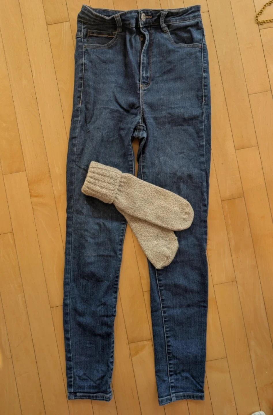 GARAGE women's blue denim jeans. Size 03. High-waisted style. Wool socks.
