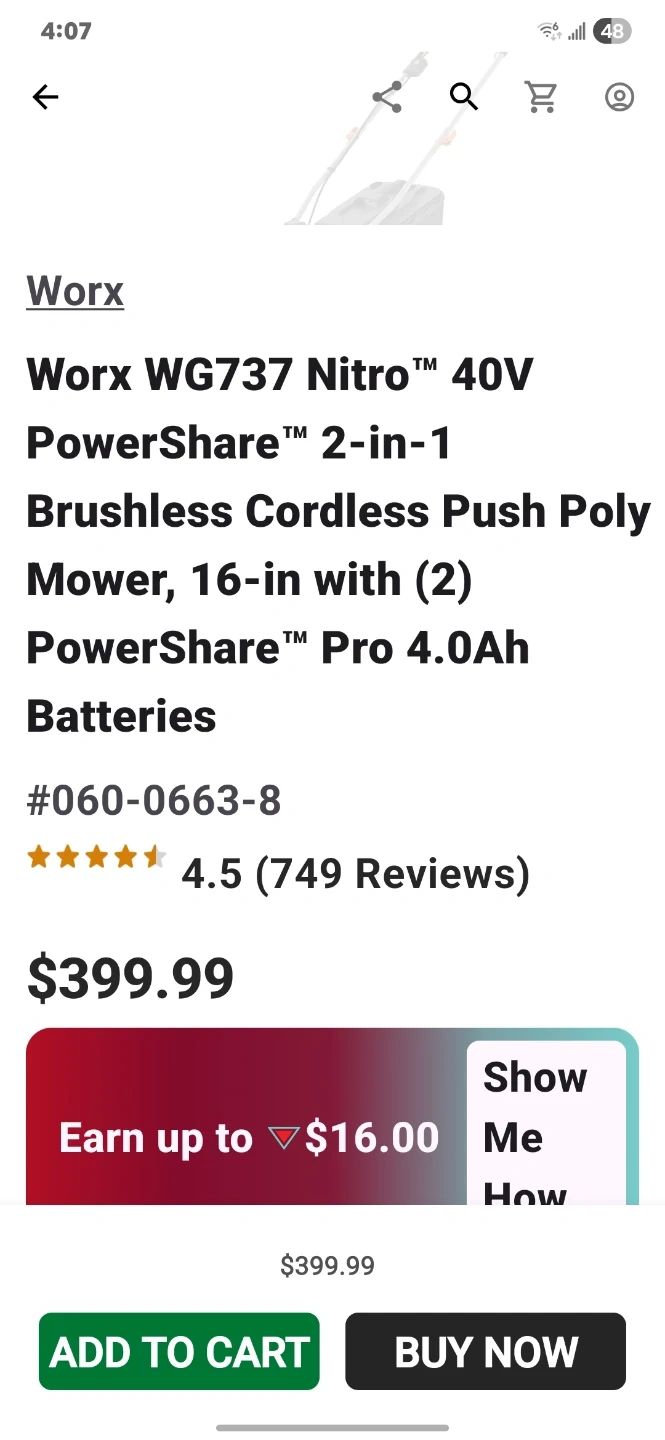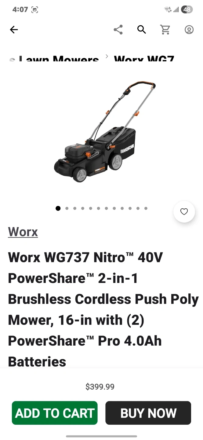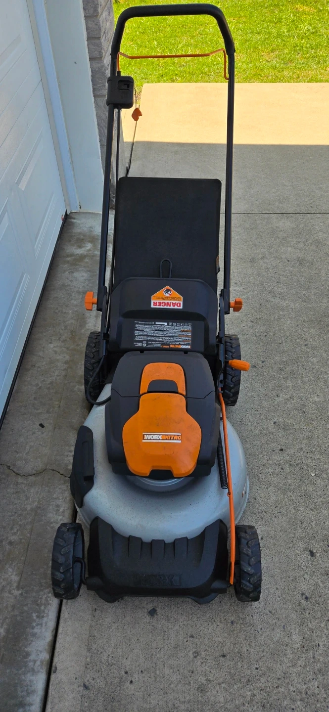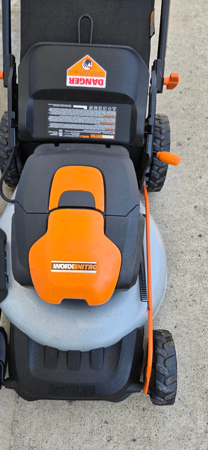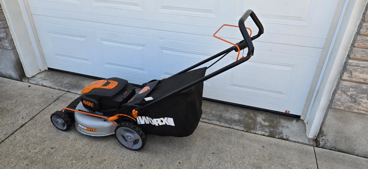 Worx WG737 Nitro 40V 2-in-1 cordless push mower. Features a 16-inch cutting deck and includes two 4.0Ah PowerShare Pro batteries. It's a brushless mower for reliable performance.