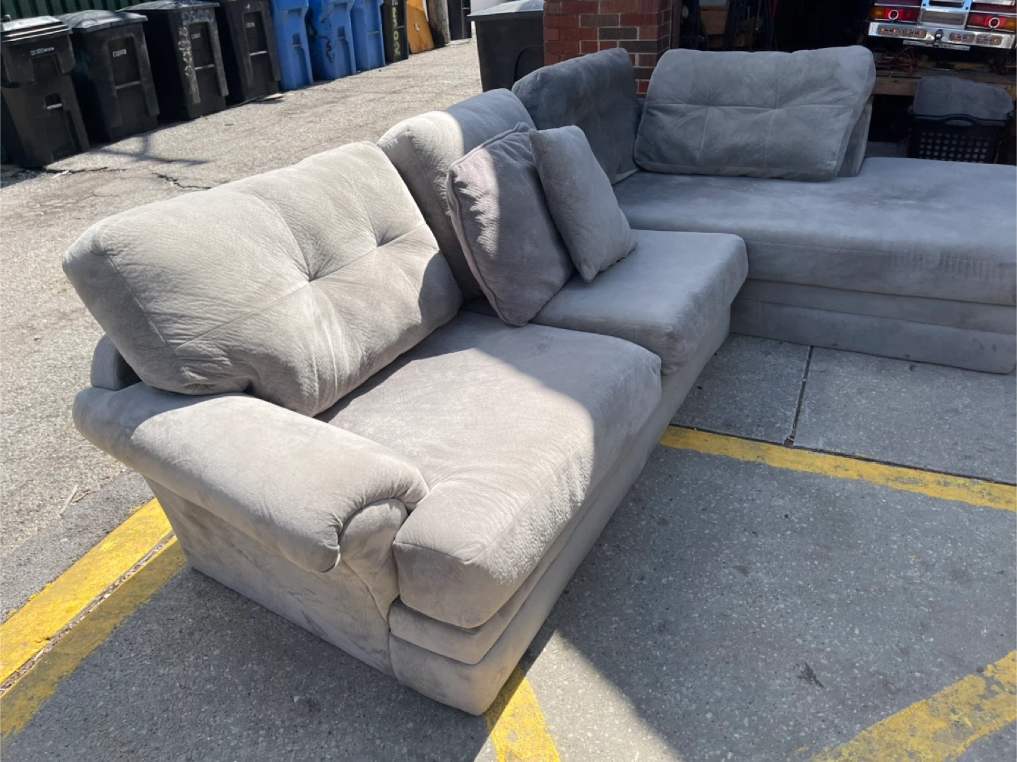 Plush grey sectional sofa with a chaise lounge. It's upholstered in a soft, velvety fabric and includes multiple throw pillows. This comfortable seating option is perfect for living rooms or dens.