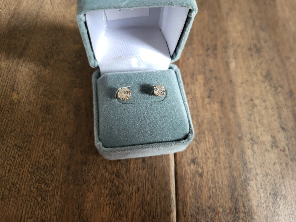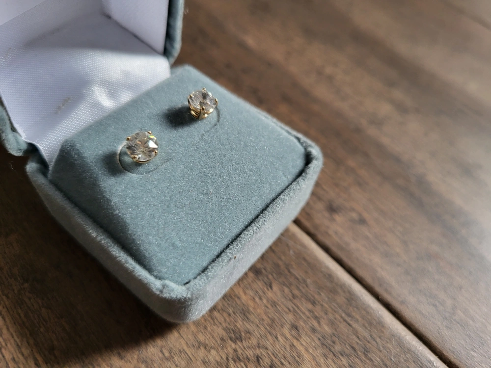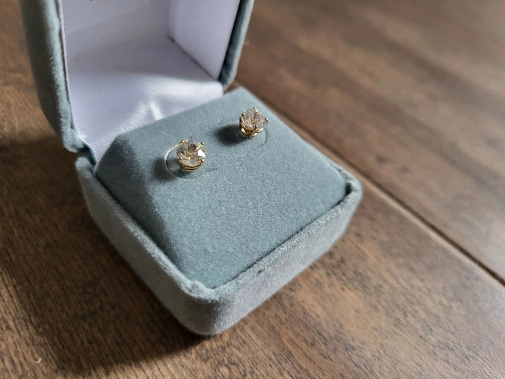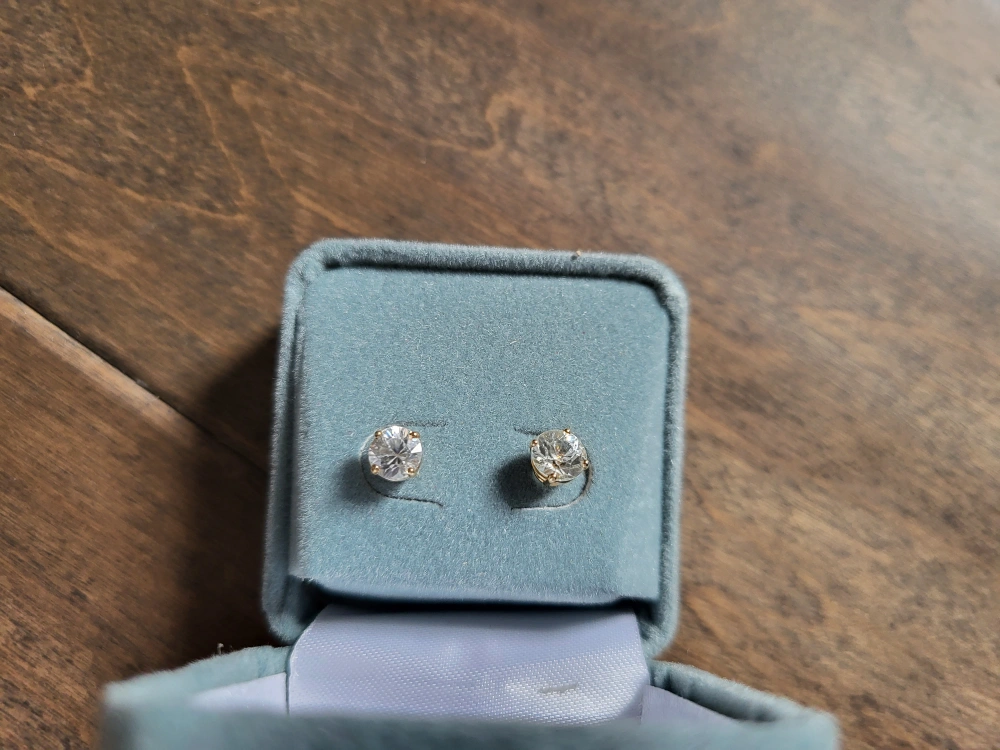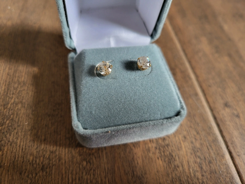 Pair of 10ct yellow gold stud earrings. Features clear stones. Presented in a jewellery box. cubic zirconia stud earrings.