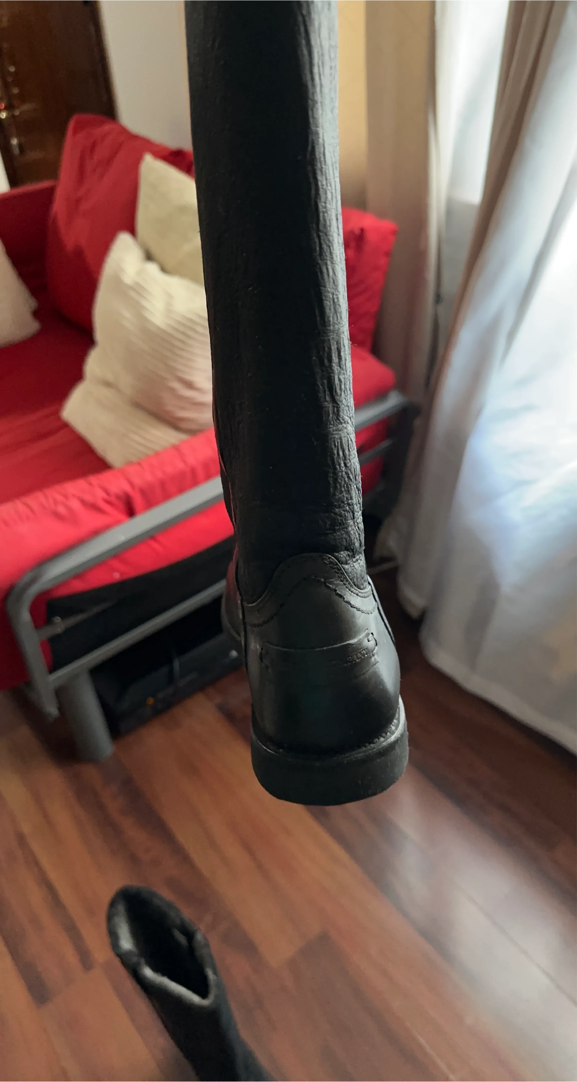 Selling a pair of black leather riding boots. They appear to be in good condition and are perfect for adding a touch of classic style to your wardrobe