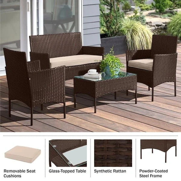 This outdoor seating set includes a loveseat, two chairs, and a glass-topped coffee table. It's made with synthetic rattan over a powder-coated steel frame. The seat cushions are removable for easy cleaning! Pickup near Harlem and Devon Chicago 60631,cash only