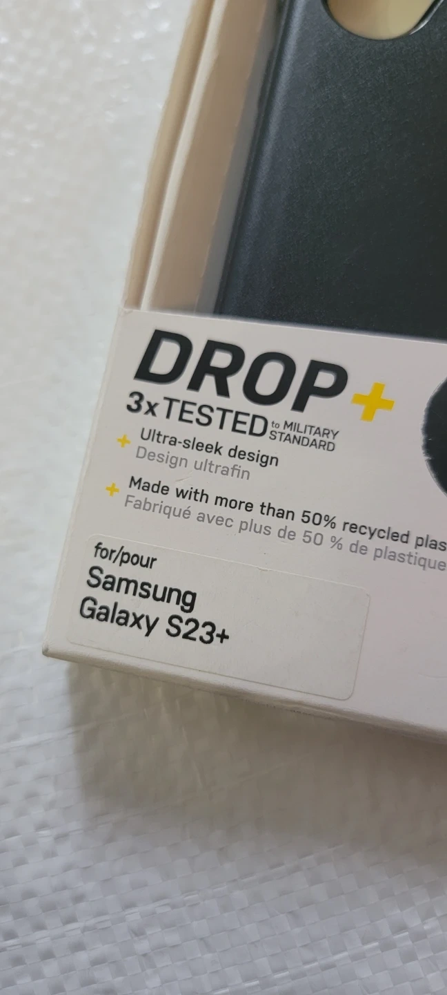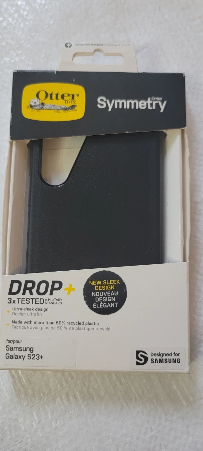 This OtterBox Symmetry Series case is designed for the Samsung Galaxy S23+. It's made with over 50% recycled plastic and offers 3x tested drop protection to military standards. Raised edges protect the camera and screen.