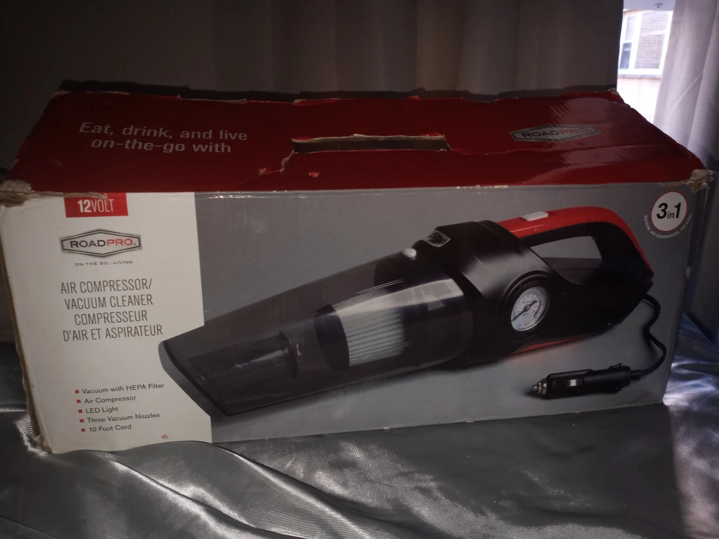 This RoadPro 12V device functions as an air compressor and vacuum cleaner. It features a HEPA filter, LED light, and includes three vacuum nozzles. It also has a 10-foot cord for convenience.