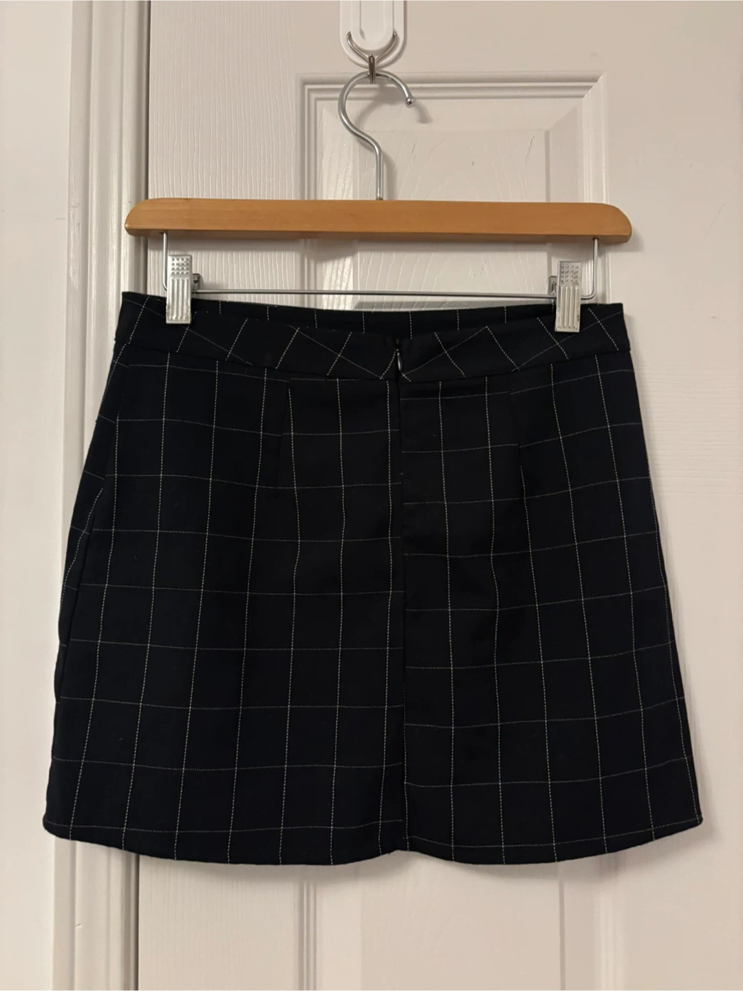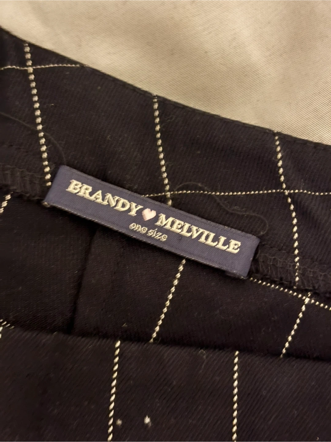 This is a Brandy Melville mini skirt in a black plaid pattern. It's a one size fits all. The skirt is made of a comfortable material and has a classic A-line silhouette.