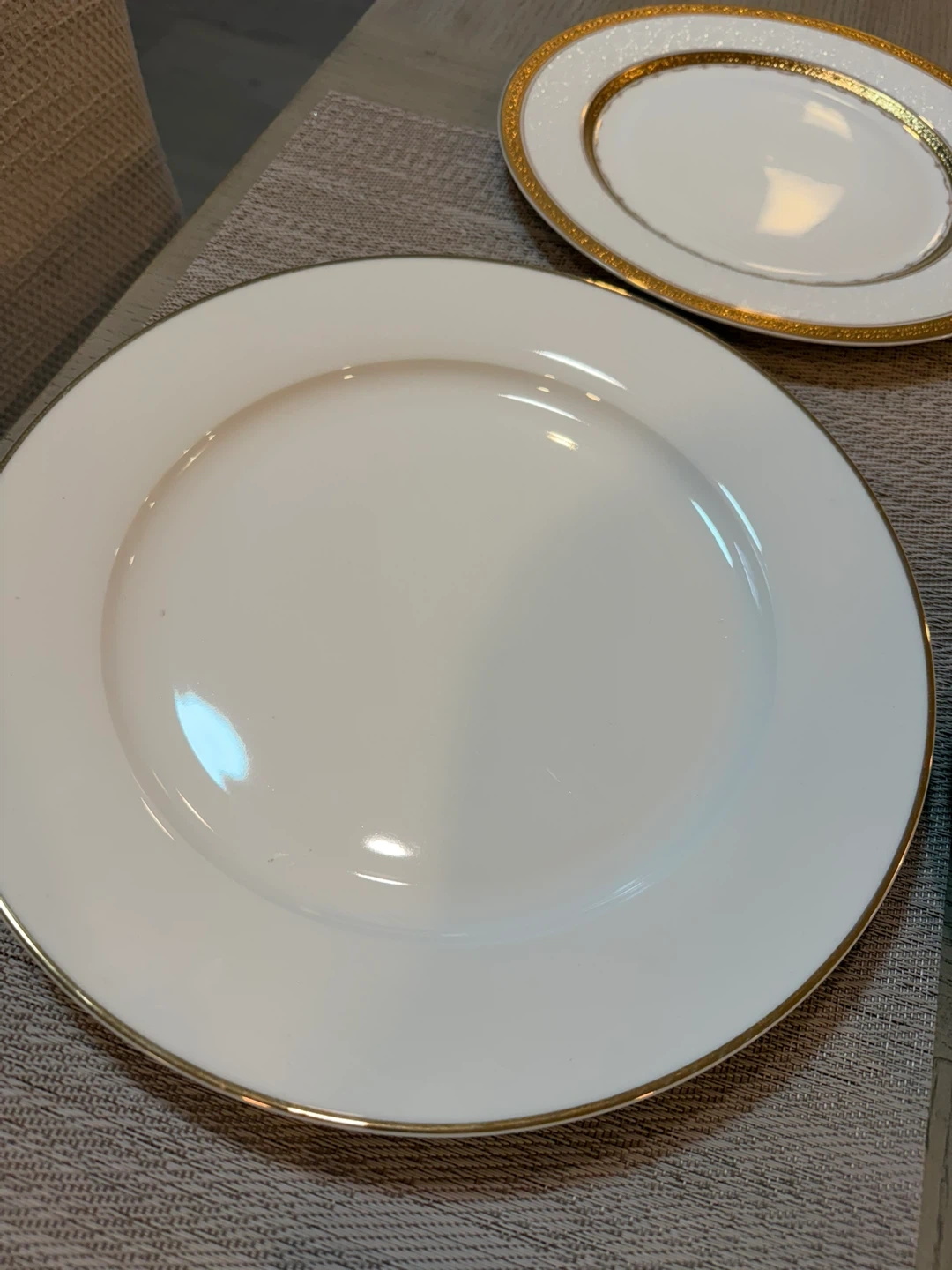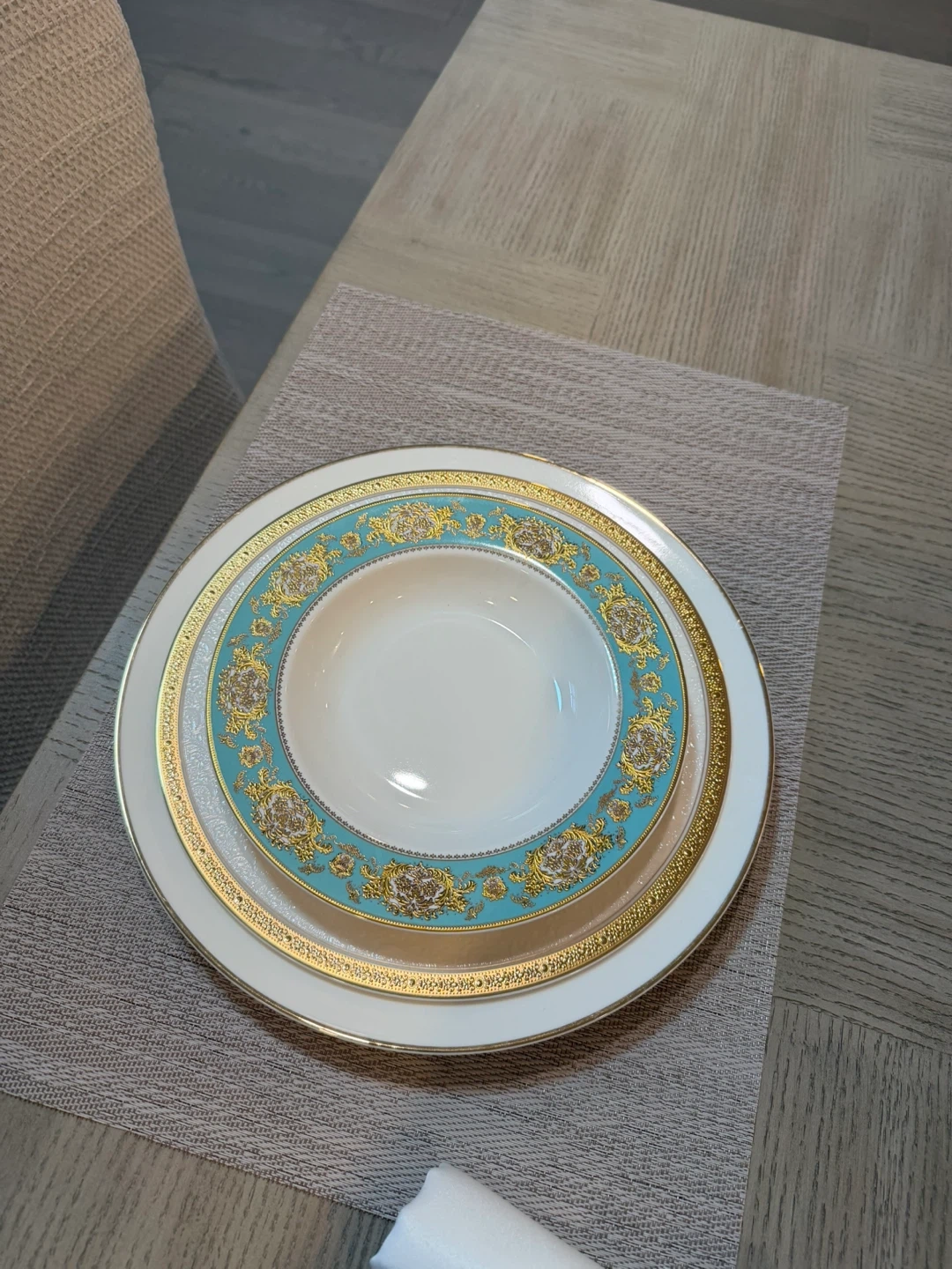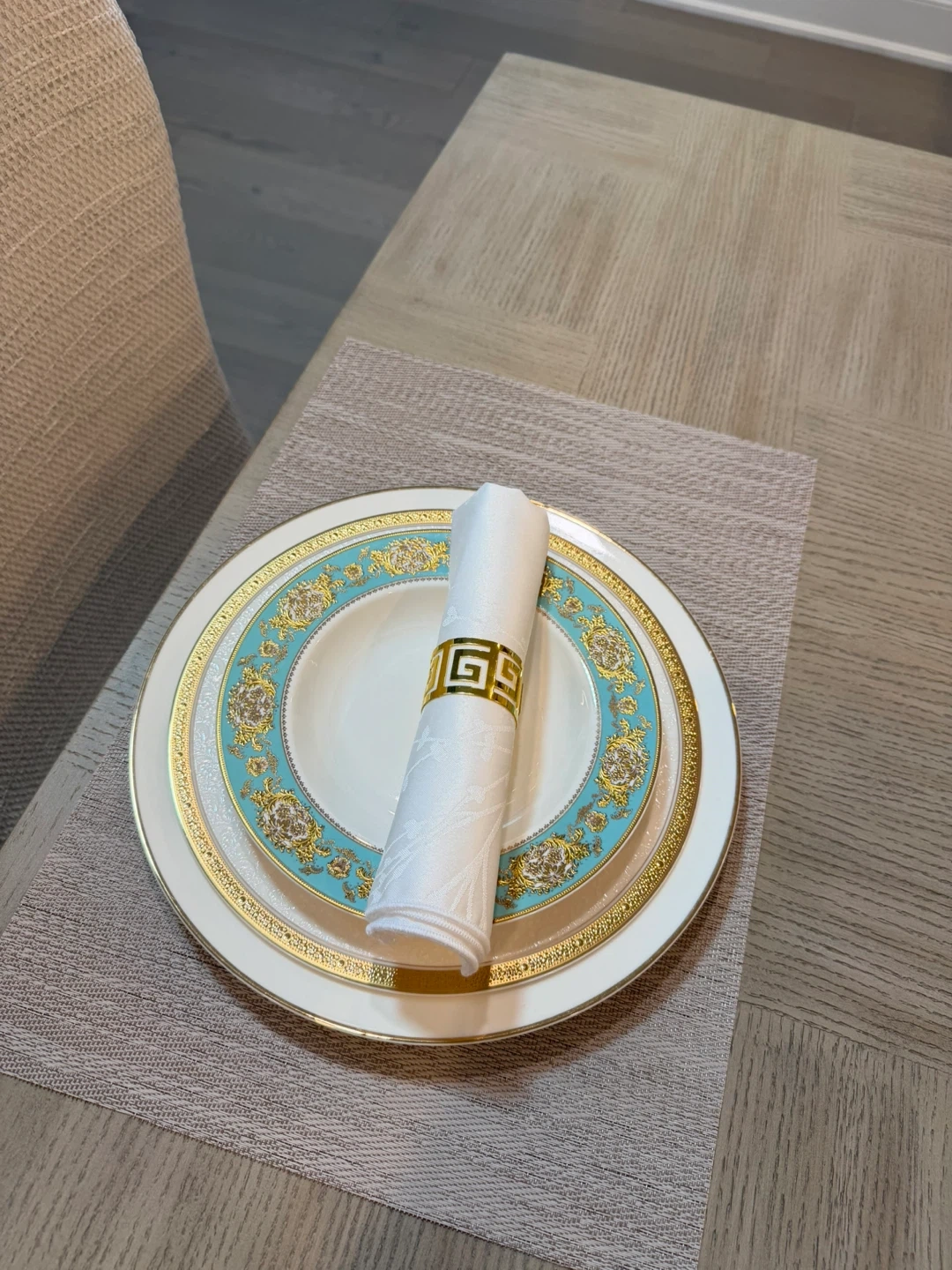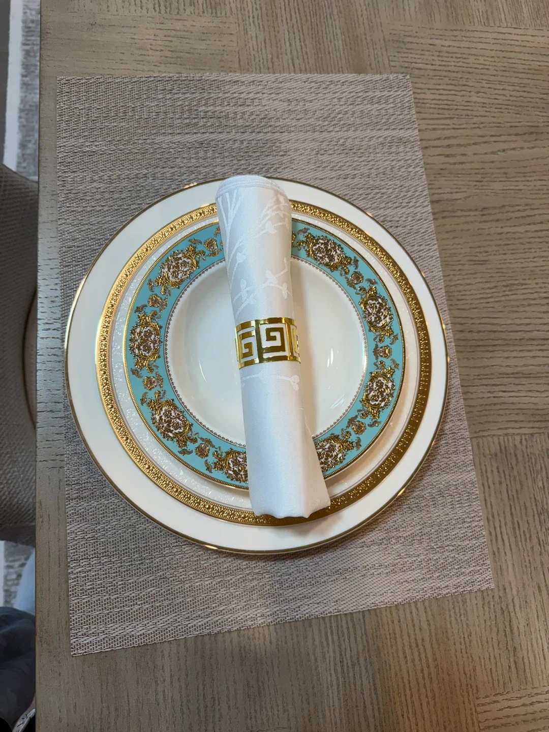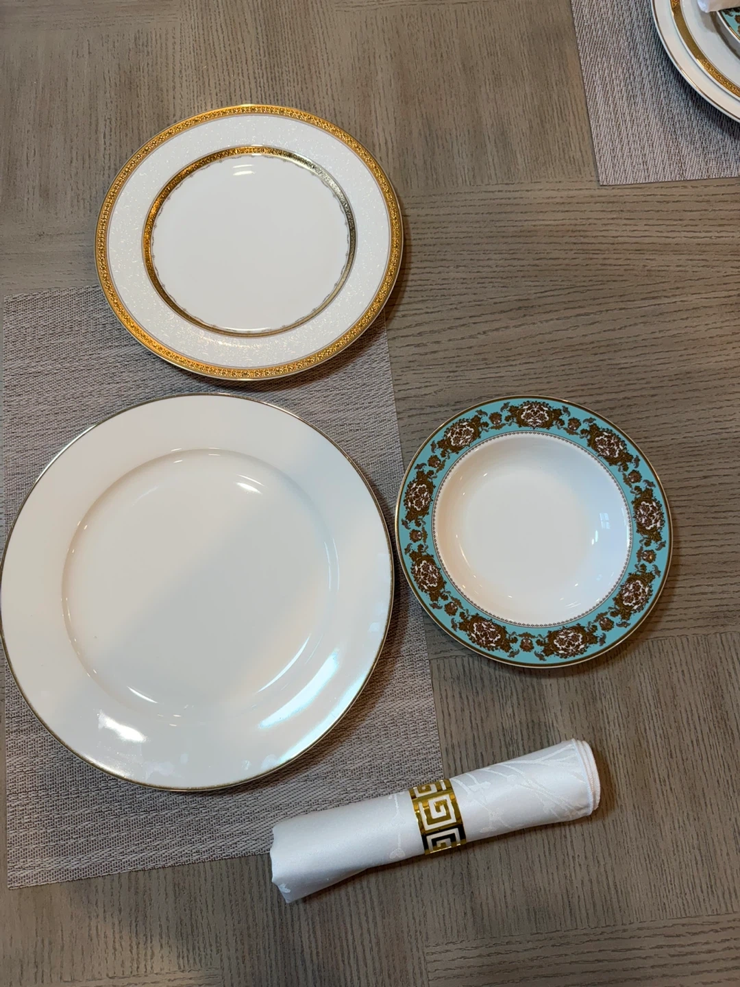 Gorgeous blue gold plate set. Includes a beautiful patterned dinner plate, a plain white dinner plate with gold rim, and a matching patterned soup/salad bowl. Also comes with a white napkin and a cool gold Greek key napkin ring. Everything looks super nice.