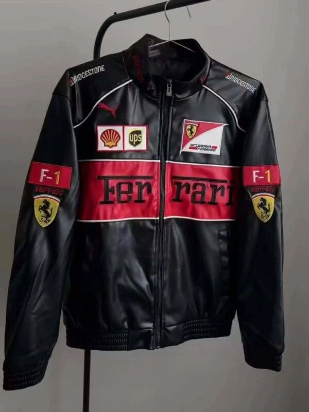 This black and red zip-up jacket features Scuderia Ferrari F1 branding and racing patches. It has a Puma logo and Bridgestone text on the sleeves. The back displays a large embroidered Ferrari horse logo.