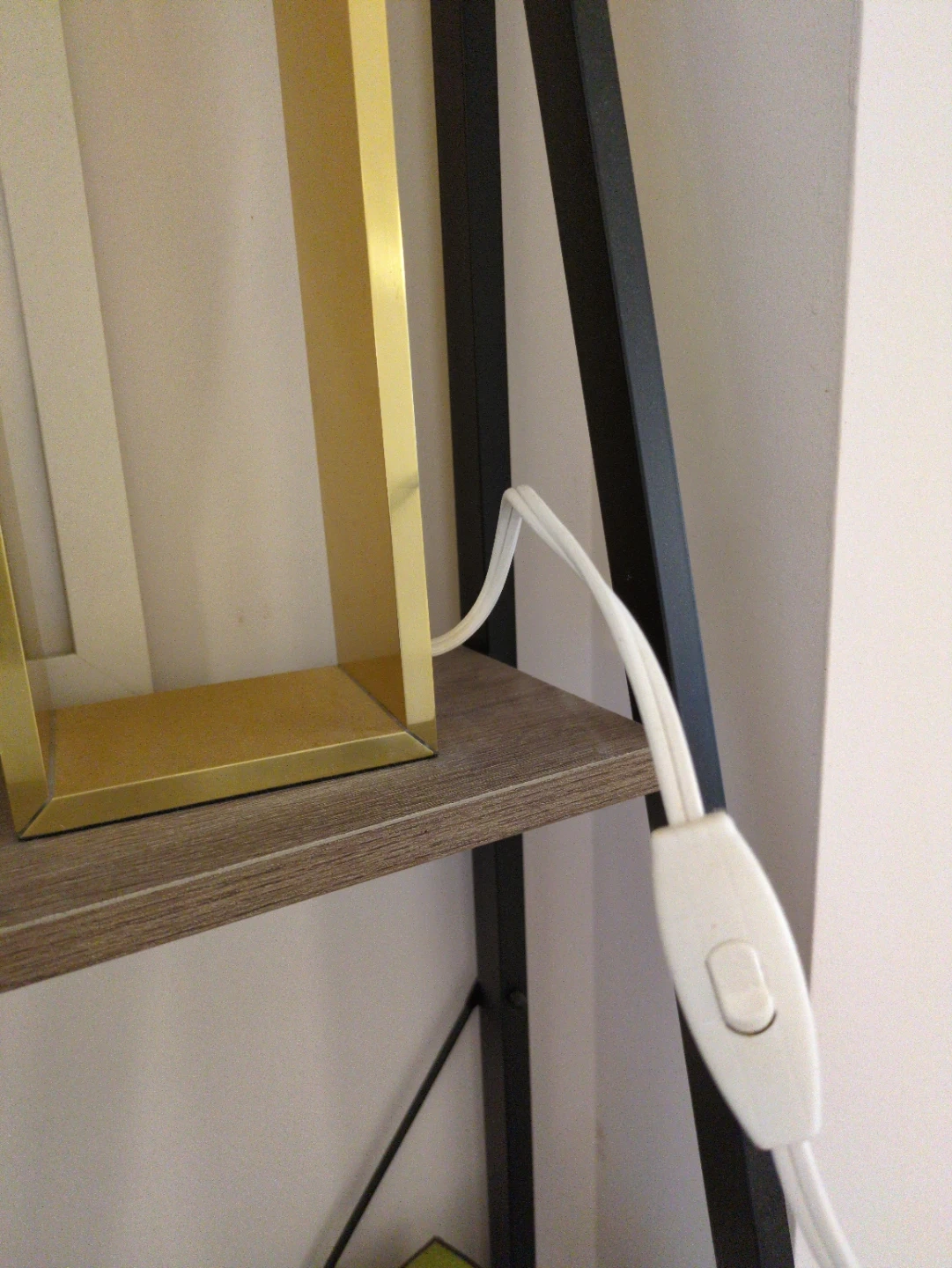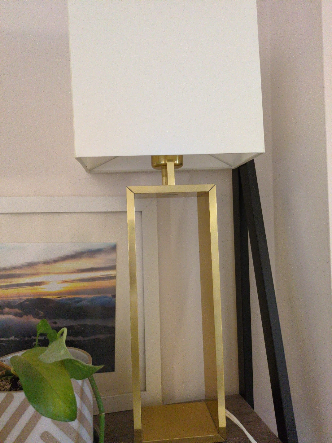 A stylish table lamp featuring a polished gold metal rectangular frame. It has a clean white fabric rectangular shade. The lamp is easy to turn on and off with an in-line switch on the power cord. Lightbulb included.